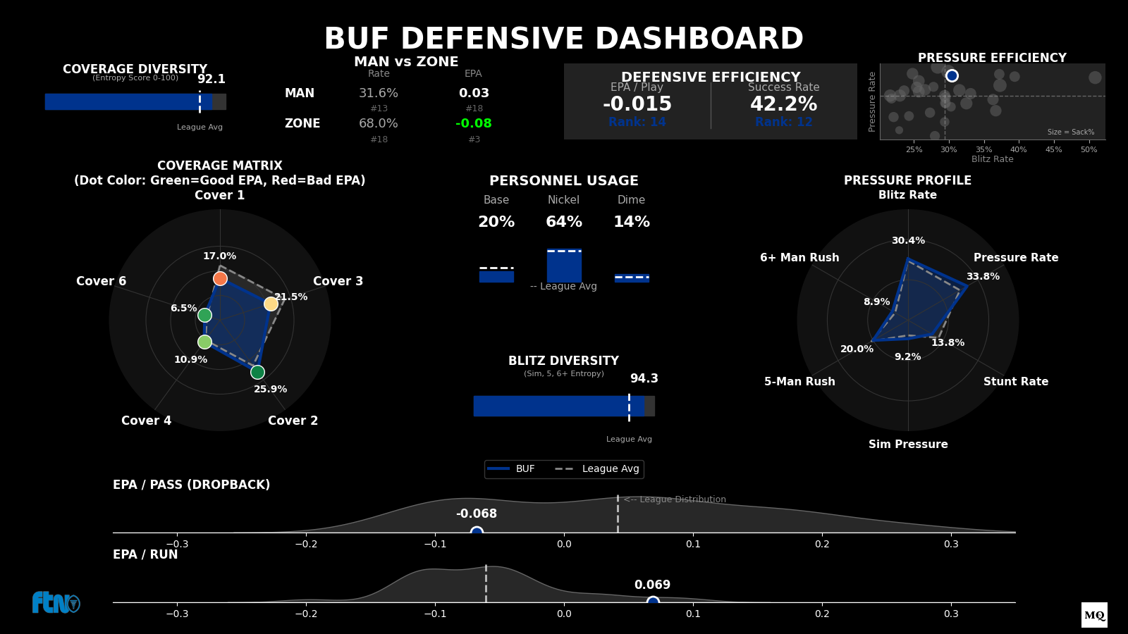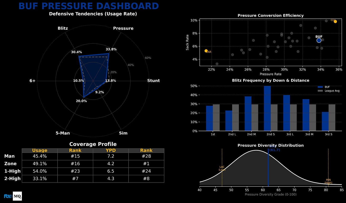 Blitz Pressure King: When they blitz, they generate pressure on 50.3% of dropbacks (Rank #1).