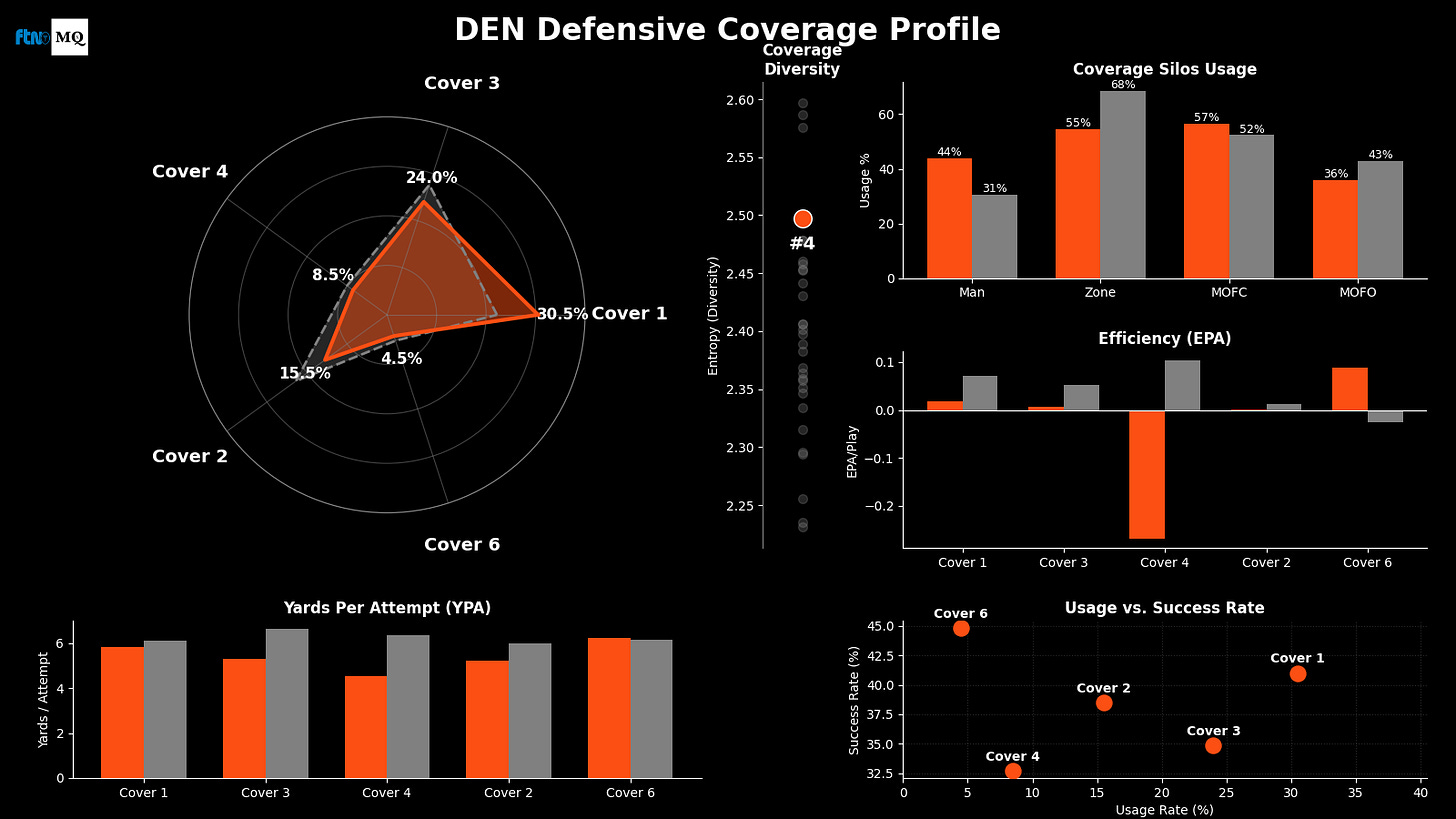Profile: The heaviest Cover 1 team remaining in the playoffs (30.5%). They live in Middle Closed shells, trusting Pat Surtain II to lock down one side while they bring heat from the other.