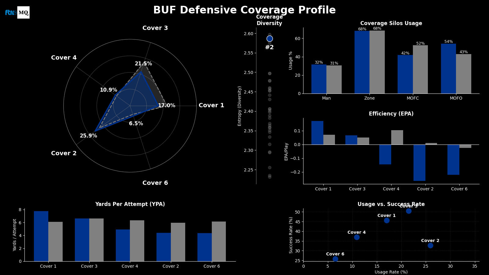 Profile: A diverse coverage unit that leans on Cover 2 (25.9%). They pair this with a heavy Cover 1 change-up, making it hard for QBs to trust their pre-snap read.