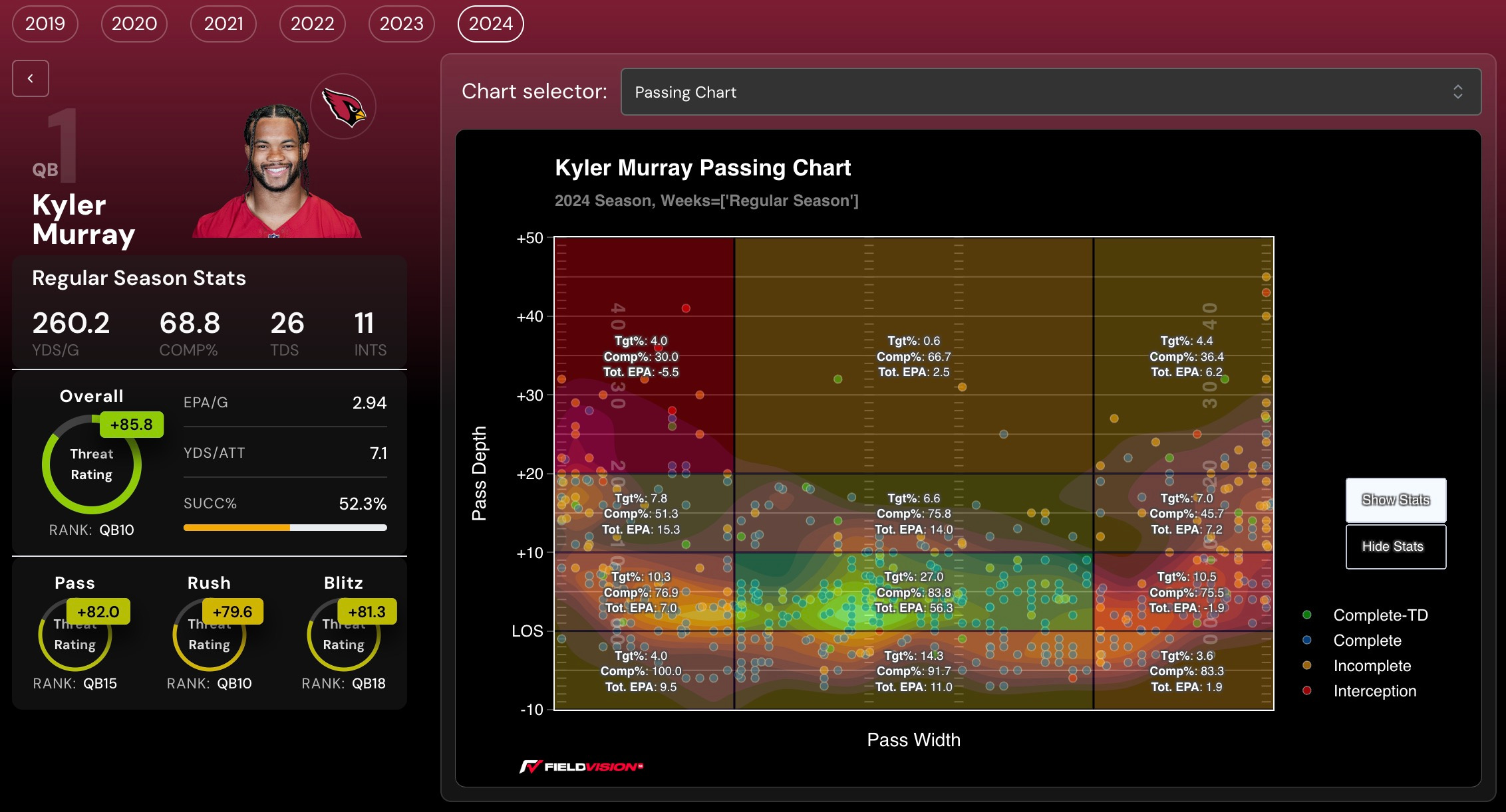 Running back James Conner was a perfect fit and has flourished in the run-dominant scheme. TE Trey McBride, drafted in 2022, has also grown in the offense, becoming one of the premier TEs in the league. He had 111 receptions last year on 139 targets for over 1,149 yards receiving. With a more robust offense, Murray has evolved into one of the better quarterbacks in terms of production (FV Pro).