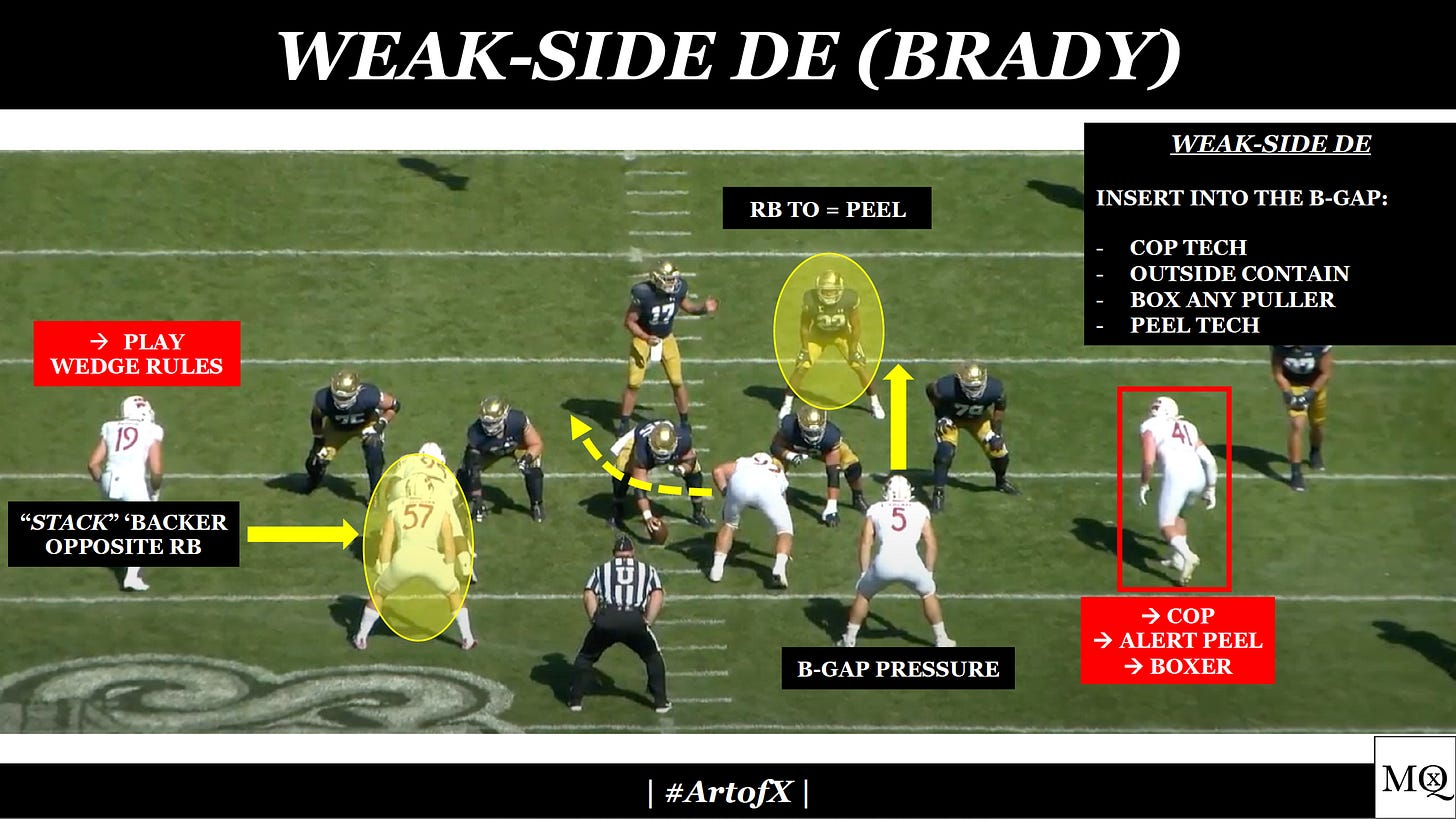 Simulated pressures are different than Creepers within my definition. Creepers, or replacement pressures, attack the edges of the box (A- or B-gap) and drop a DE opposite the pressure. The technical term “replacement pressure” illustrates the see-saw action of the defense post-snap. Pressure from one side of the box from a second- or third-level defender and a first-level defender dropping into coverage opposite. One of the more popular versions of a Creeper is the Brady (boundary) or Whip (weak) path shown below.