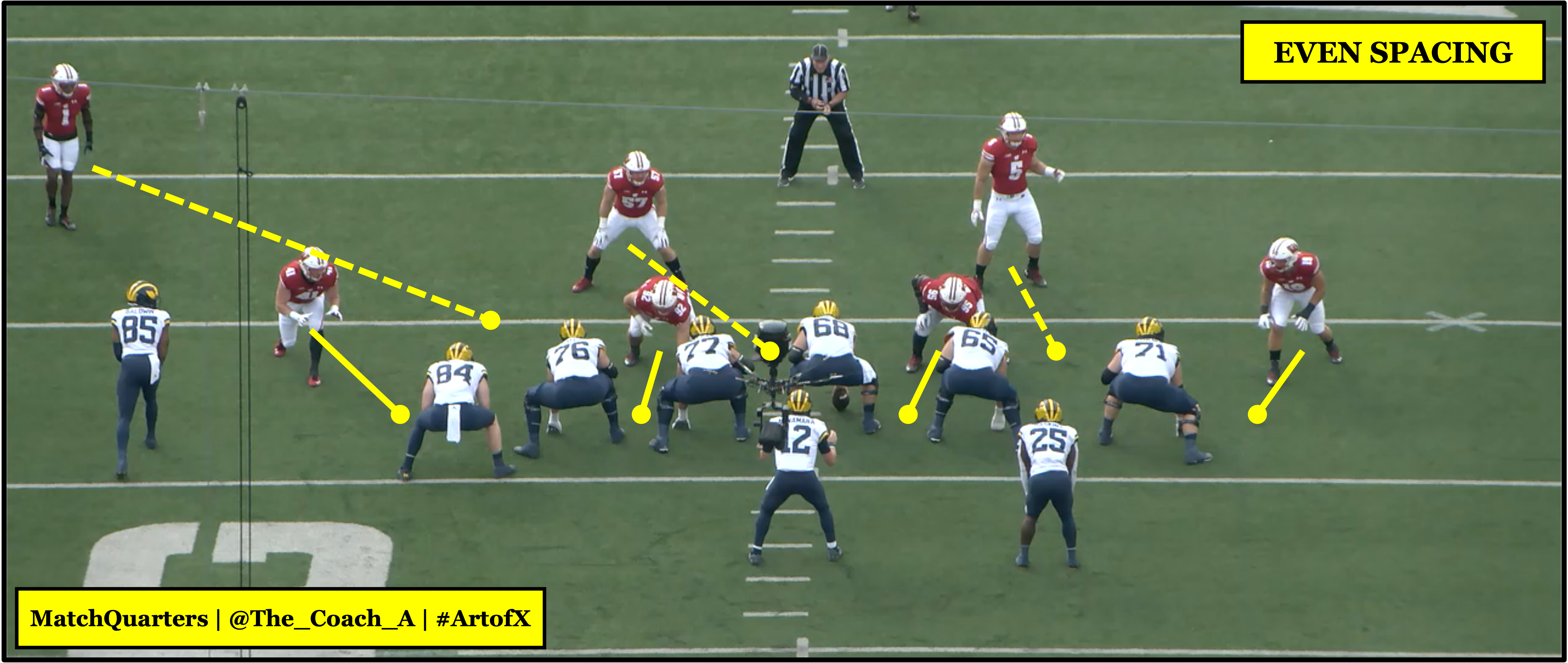 Jim Leonhard is one of the best DCs in the country and had it not been for Georgia’s dominant season on defense, the Badgers would have been the talk of college football. Leonhard meshes even spacing alignments with traditional Tite Front Creepers. The above image is how the Badgers can fit a typical Y-Off formation from a basic “G” Front (2i), in single-gap even spacing.