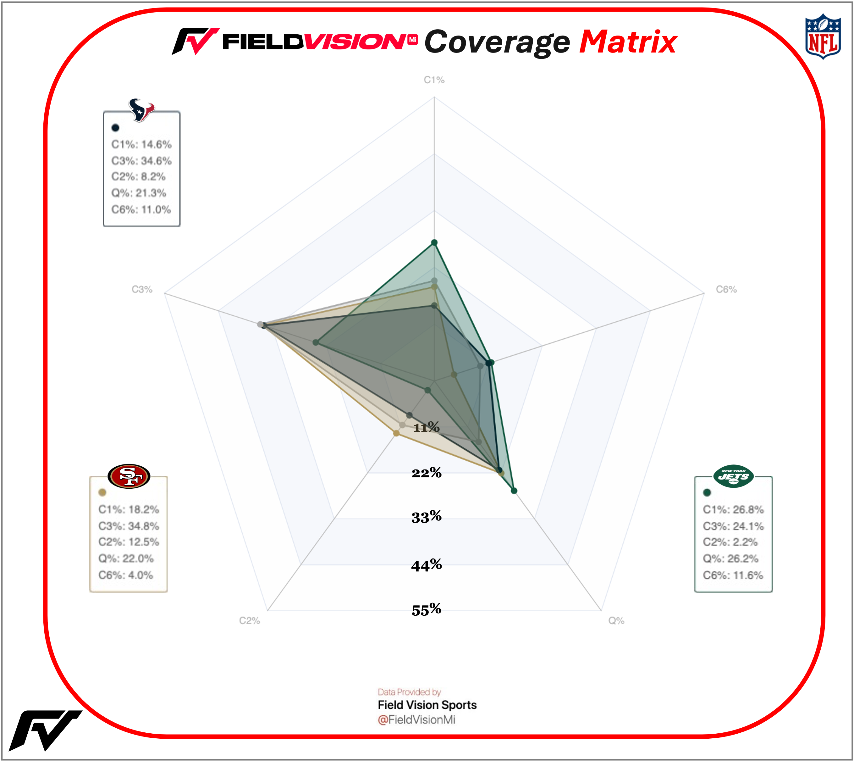 The ‘Shanahan’ defensive style of play was developed once Saleh became the DC in ‘17. After the ‘18 season, Saleh felt he needed to depart from the Pete Carroll tree and start running more Quarters. In ‘17 and ‘18, Quarters only accounted for ~3% of the 49ers coverage choices. In ‘19, that number jumped to ~21%.