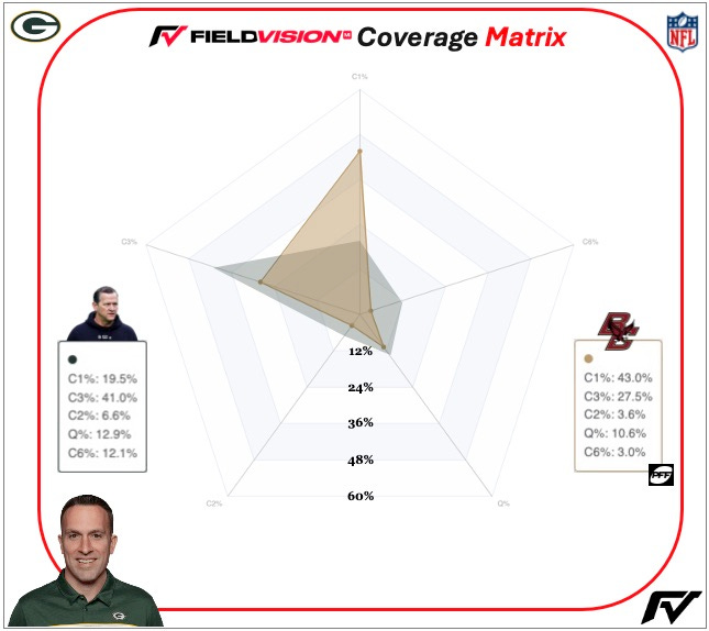 In my opinion, Hafley will most likely reflect what Saleh is doing with the Jets. Cover 1 and Cover 3 will be very similar in usage, with Quarters tags as a change-up on early downs and basic Quarters on 3rd Downs. The Packers will likely play relatively ‘static’ coverages similar to the others from this tree. Boston College disguised its coverages on 11.1% of its downs (PFF). Where Hafley will depart from this tree is in his blitz schemes, as he is clearly a student of the Rex Ryan approach.