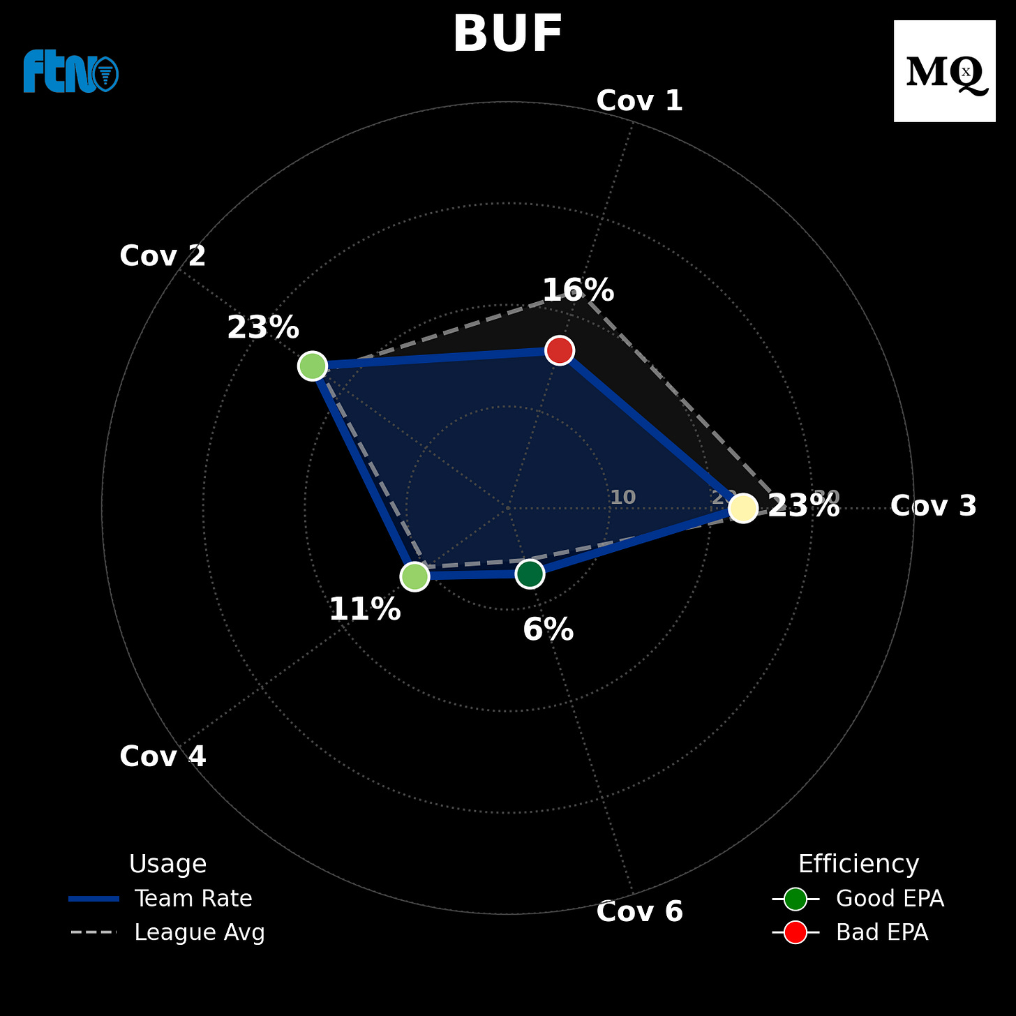 In 2025, the defense is playing even more man coverage, entering Week 15 ranked 15th in Man% (~31%). Benford, Bishop, Johnson, and rookie Maxwell Hairston allow the defense to lean more into these coverages. Still, this is a split-field defense that only trails Minnesota in middle-of-the-field open (MOFO) usage (53%).