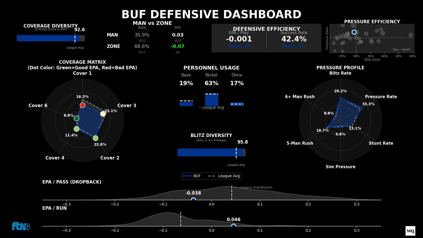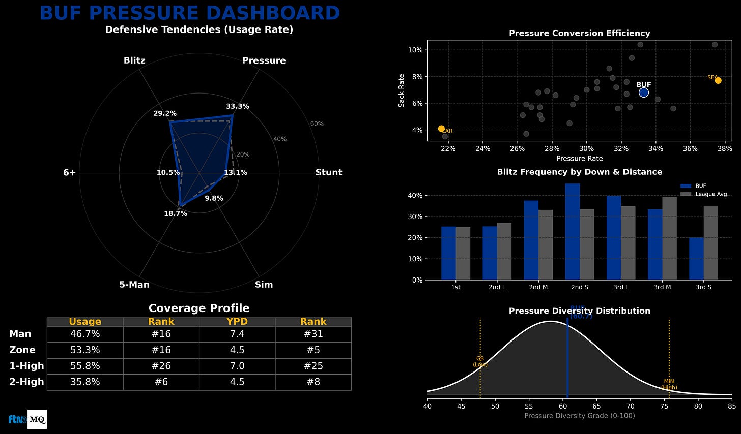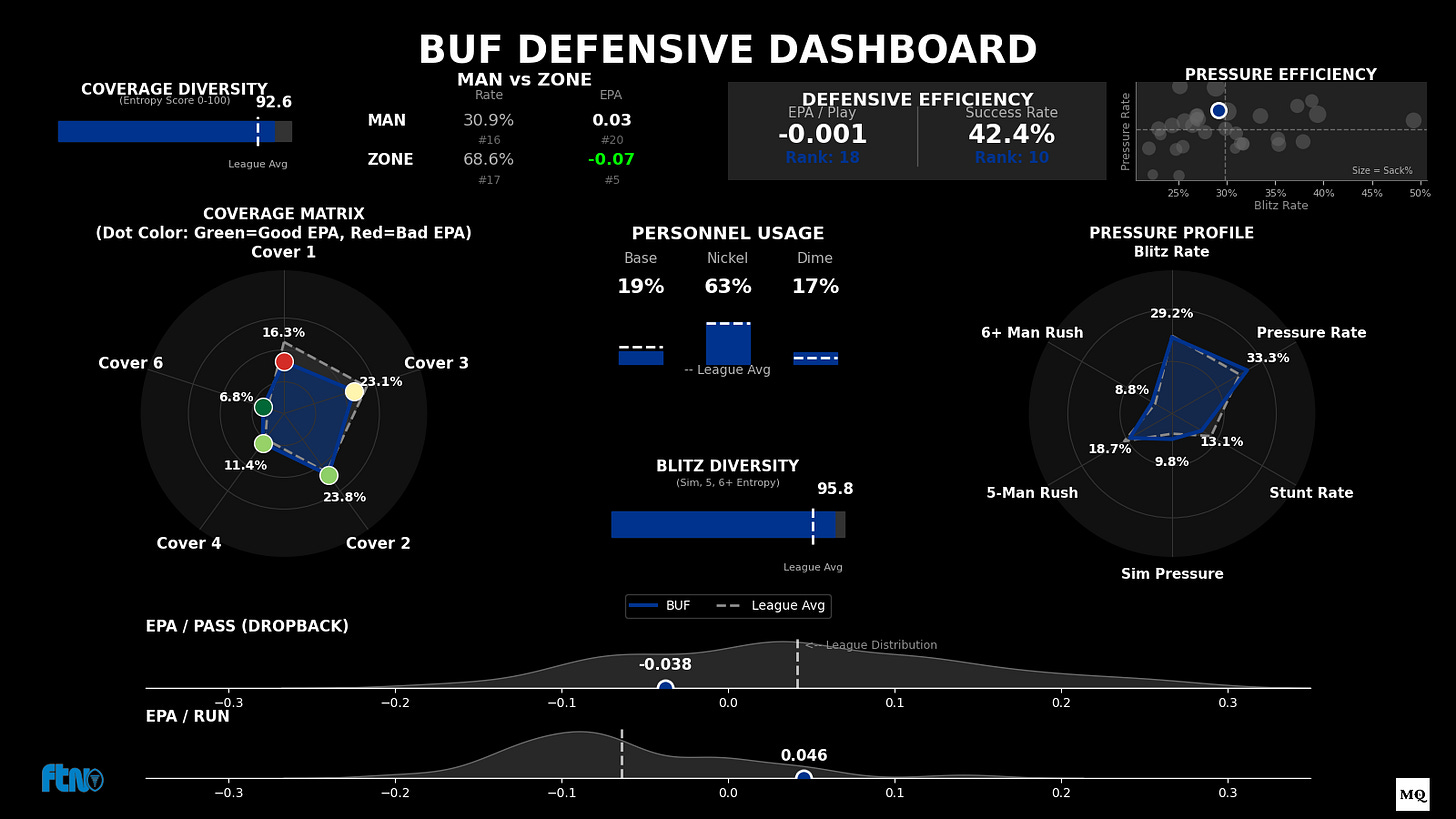 Entering Week 15, the Bills ranked 15th in the NFL in Blitz Rate, just below the ~30% league average. As the dashboard above illustrates, the split-field dominance doesn’t change when blitzing. Buffalo is 6th in split-field pressure usage and a top-ten secondary when running them, allowing only 4.5 yards per attempt.