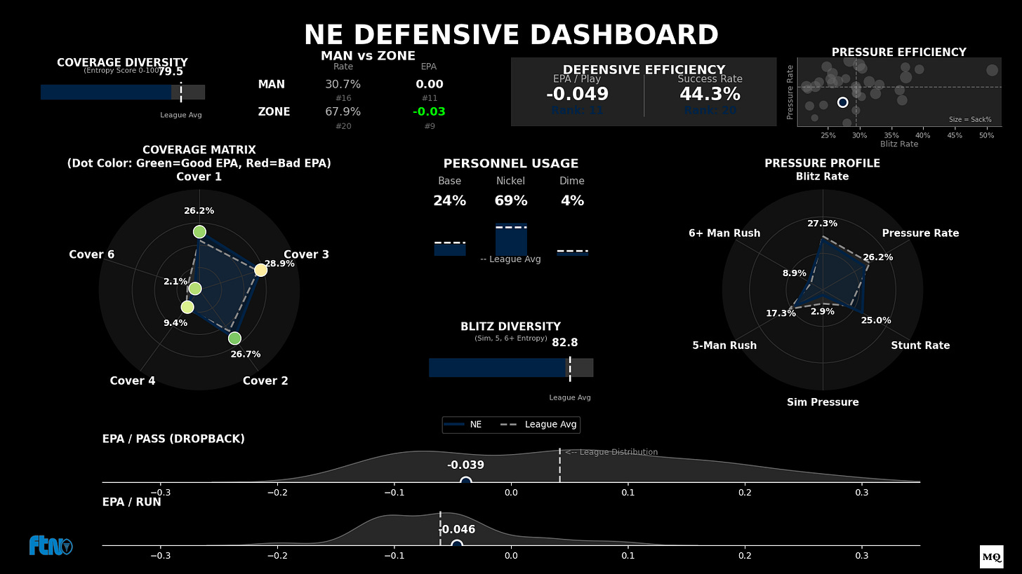 Identity: Despite a heavy investment in Nickel (69.2%) and a stunt-heavy front (2nd in Stunt Rate), the Patriots have struggled with consistency against the pass (25th in Pass DVOA). This suggests that while they are structurally sound at preventing explosives (9th in Explosive Rate), they are losing efficiency on a down-to-down basis.