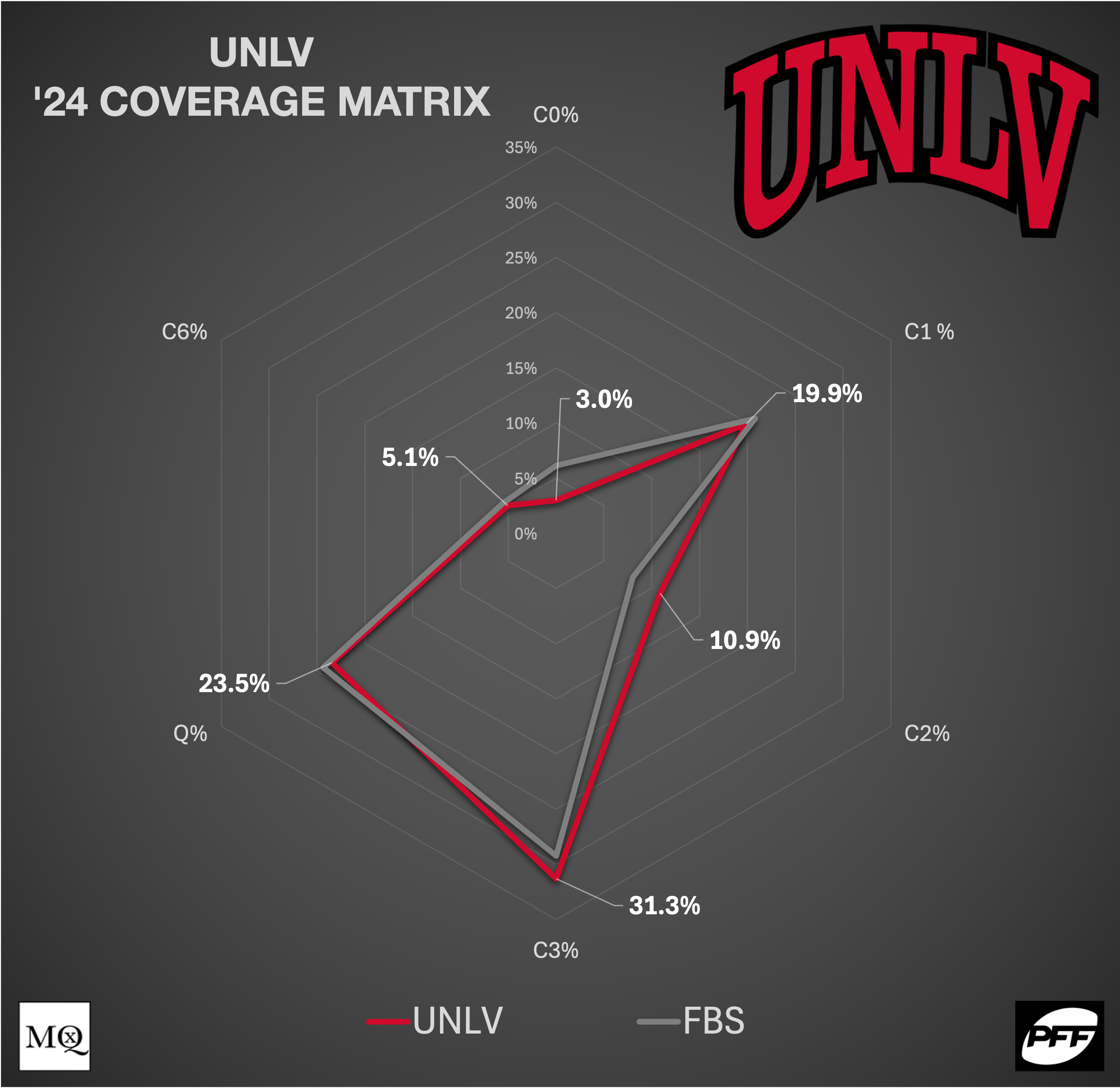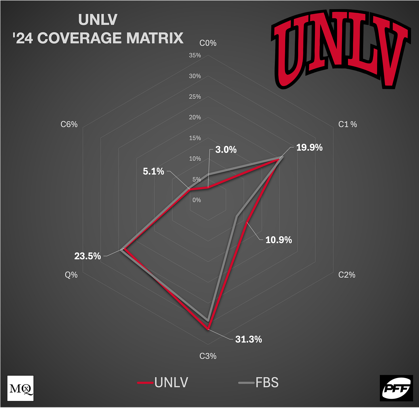 Odom would bring the same three-high structure in Las Vegas, but he could easily change that depending on need and talent availability. Like so many hybrid schemes, the Rebels’ defense is multiple. There are different front structures to match offensive diversity and personnel. Odom’s coverage selection reflects the national average in almost every category (above).