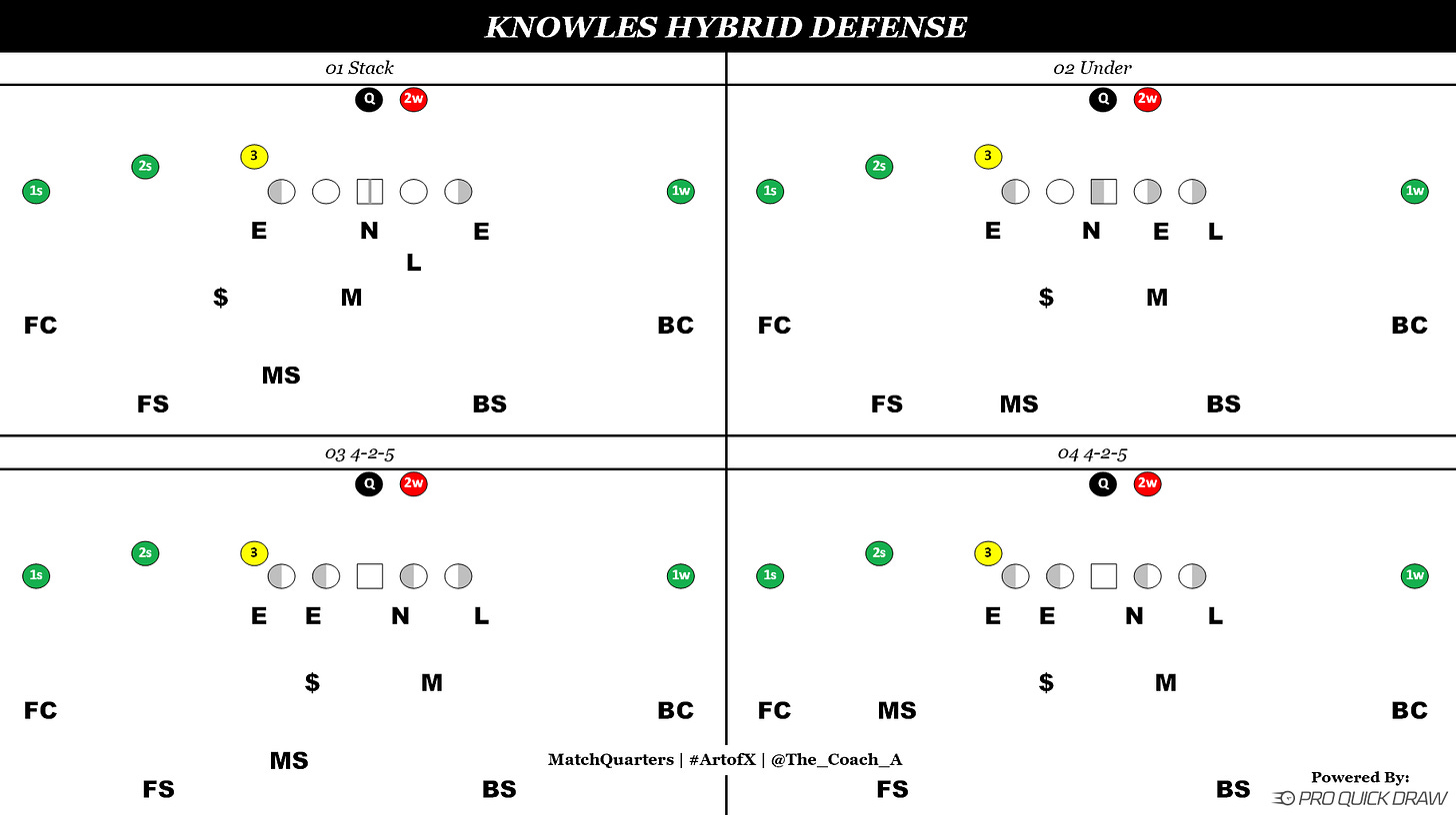 Most Odd Stacks have a way to get into even spacing structures. Knowles and others use a hybrid Edge and move him around to work different angles and pressures against an offense. This concept can confuse offenses, which must account for a different look each down while the defense can play fast.