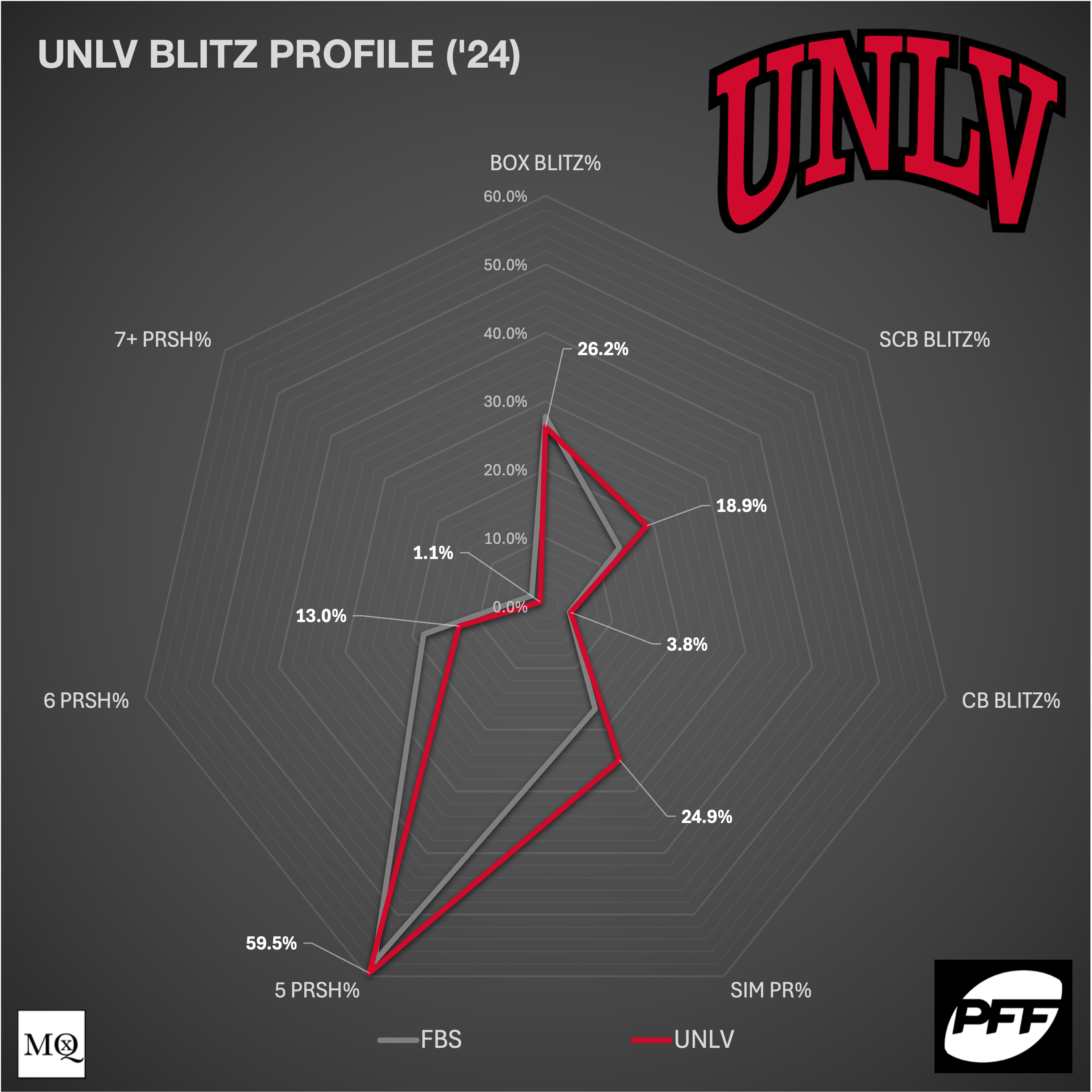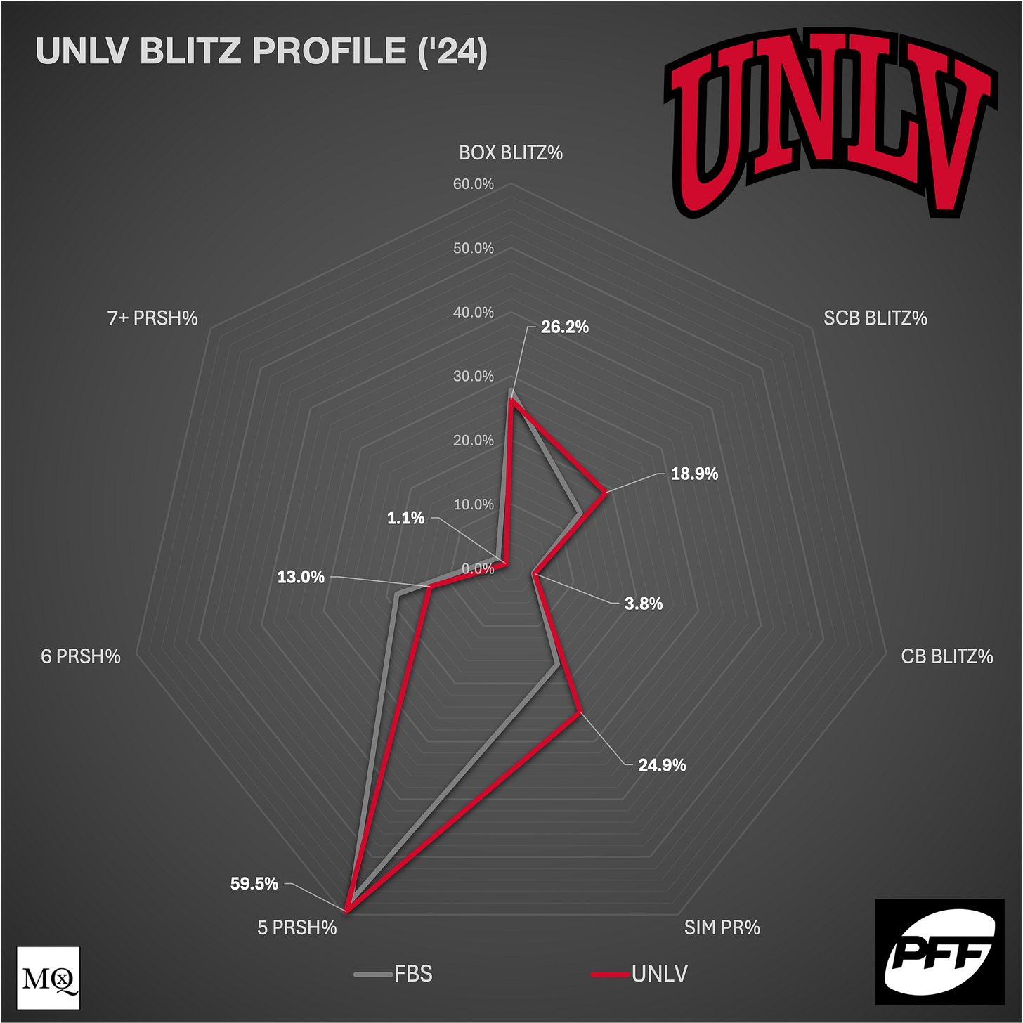 Regarding pressure, UNLV used mainly five-man pressures, with over a quarter of their calls coming as sim pressures or four-man rush ‘blitzes.’ Almost 60% of the pressures were caused by the two primary off-ball linebackers. ‘Pressure’ many times in hybrid structures could be as simple as placing the Leo in an interior gap and rushing him. Technically, these are pressures, but oftentimes, the coach refers to them as structural adjustments.