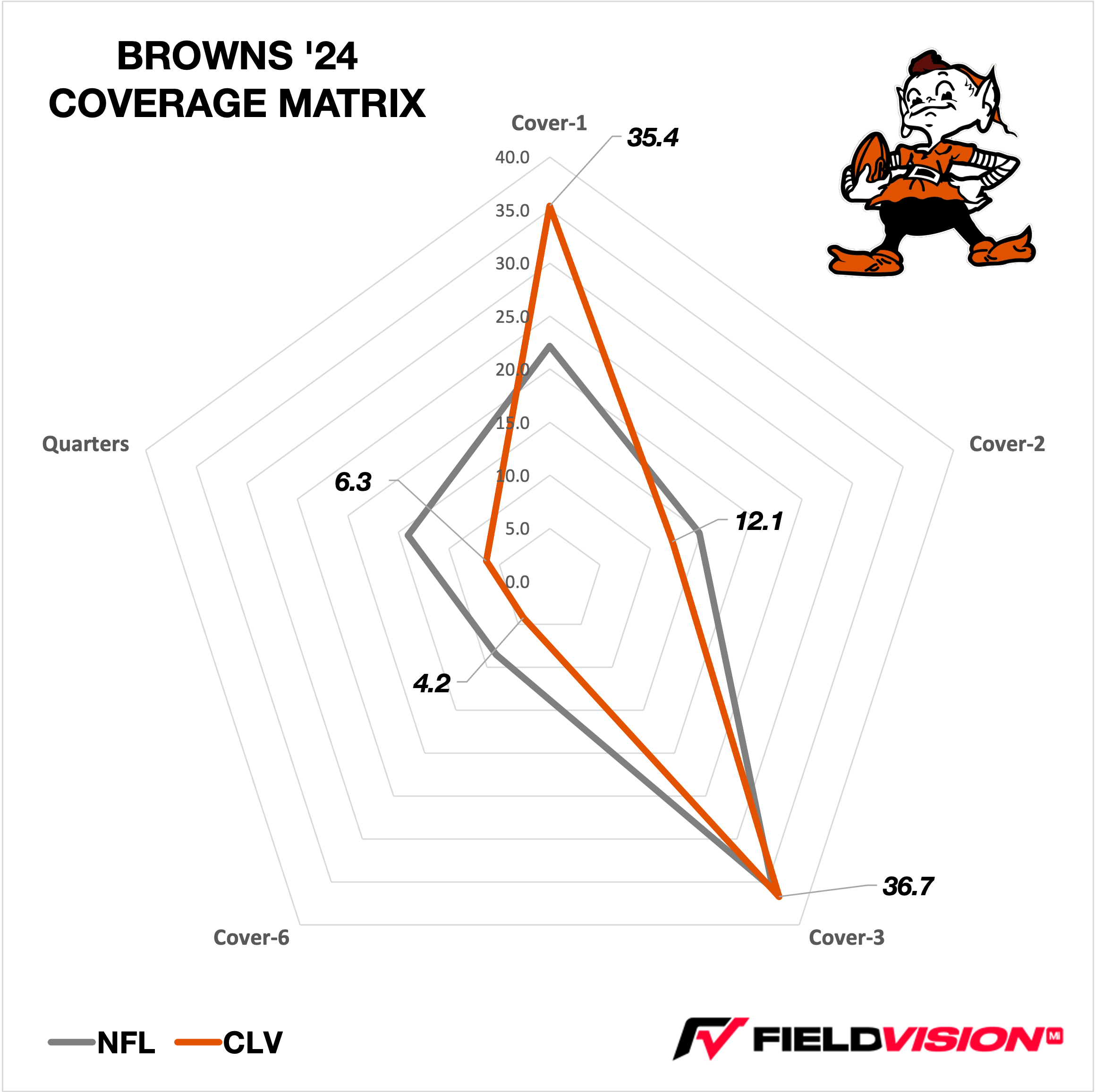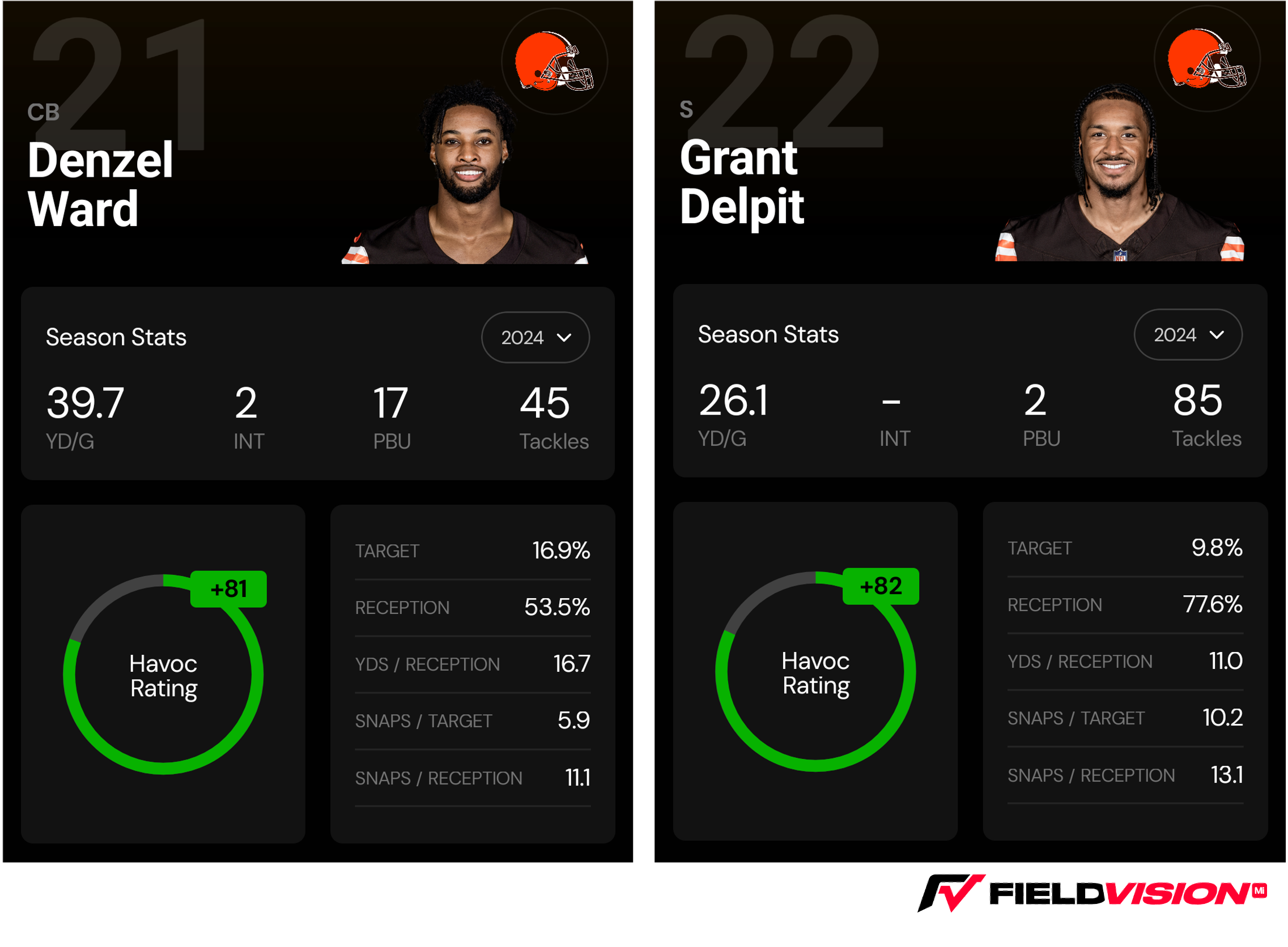 The ineptitude at quarterback masked other issues along the roster, mainly in the secondary. Last season (‘23), Nickel Greg Newsome was the 23rd-ranked CB in Field Vision’s Havoc Ratings. In 2024, he slid to 132nd. Third-year CB Martin Emerson Jr. finished the ‘23 season as the 16th-best CB in Havoc and looked to be a rising star as one of the NFL’s best young DB prospects. In ‘24, he returned to Earth as the 131st-ranked CB in Field Vision’s Havoc Ratings.