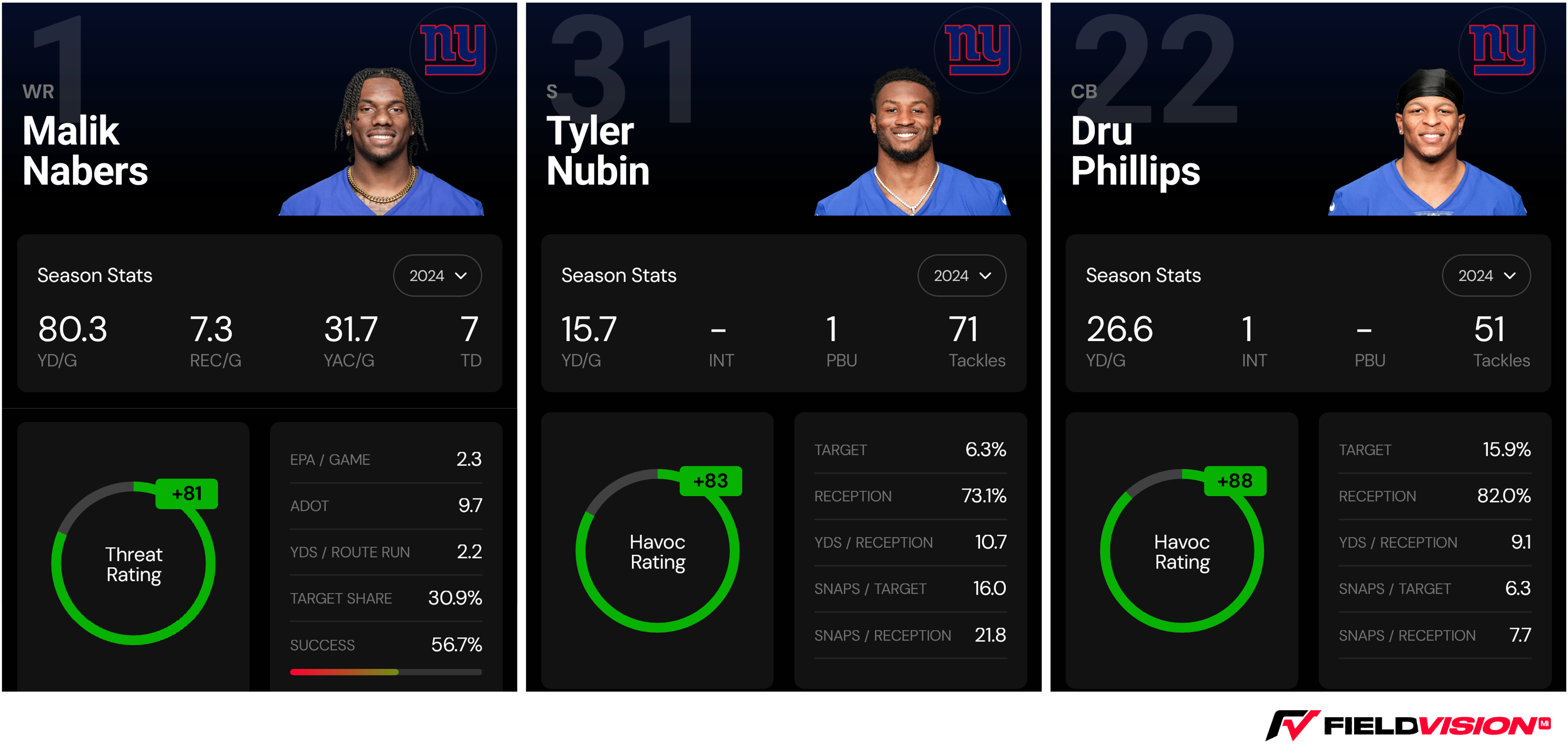 The Giants’ first three draft picks look to be all hits. Malik Nabers finished as the #11 WR in Field Vision’s Threat Ratings, making him the best rookie receiver in ‘24. Tyler Nubin, their second-round pick, concluded the season as the #18 Safety in Field Vision’s Havoc Ratings. His third-round counterpart, Dru Phillips, also looks to be a long-time starter in New York, finishing ninth in Havoc and the #3 Nickel in the NFL last year behind the Ravens’ Marlon Humphrey (CB1 in Havoc) and the Colts’ Kenny Moore.