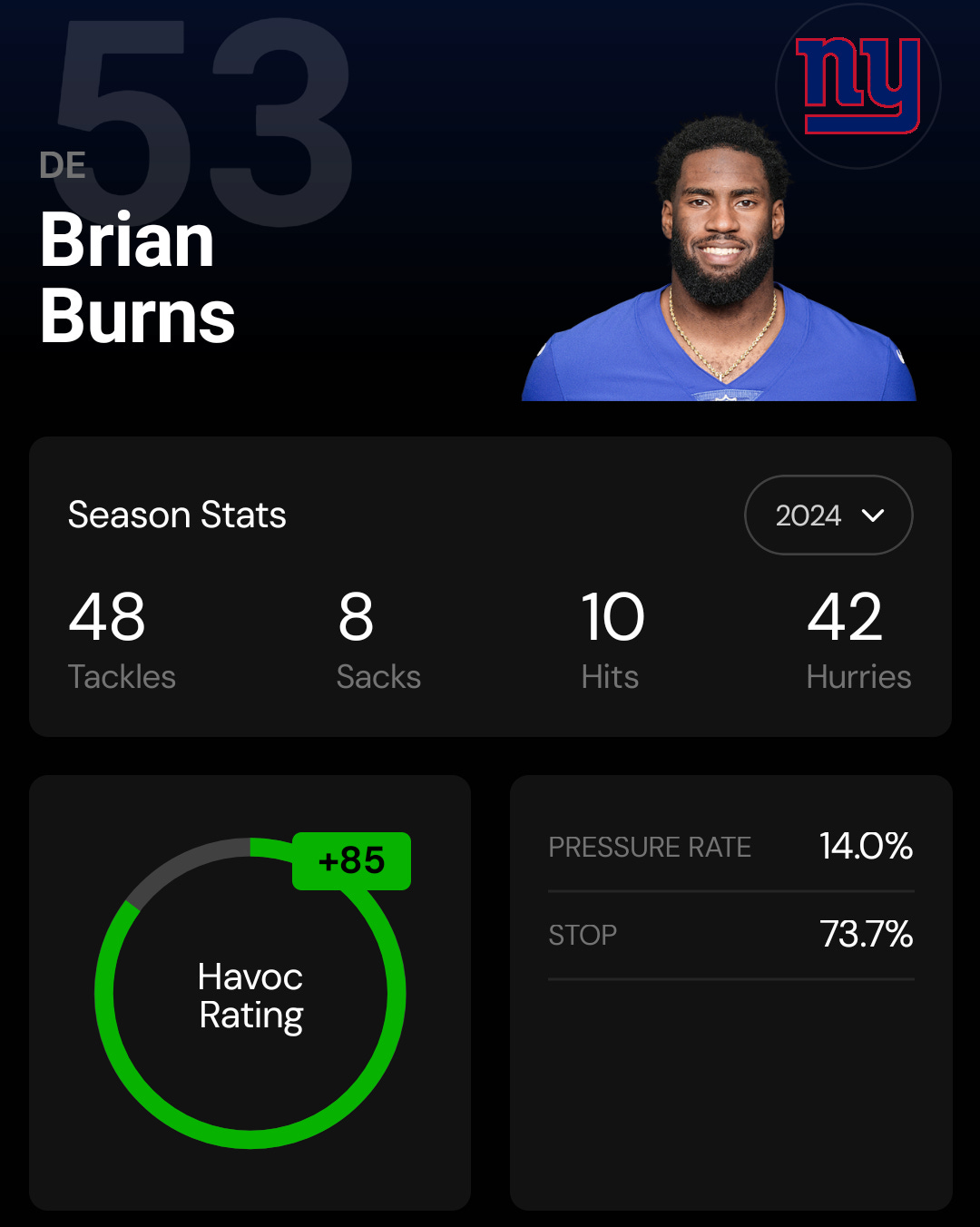 In free agency, the Giants traded for the Panthers Edge Brian Burns for a second and fifth-round pick. The organization quickly inked a five-year $141 million deal ($87.5 million guaranteed). The move instantly bolstered the Giants’ pass rush. In ‘24, New York would finish eighth in Sack% (7.1%). Combined with Dexter Lawrence (DT8 in Havoc), New York has two of the best D-linemen in the league.