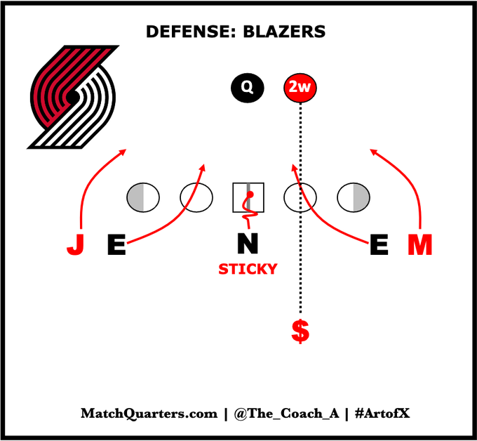 The “Ameba” front is nothing new to defensive football. However, the thought process behind the alignment is that because there is no proper structure, the offensive line will struggle to decide how to divvy out the blocks. So what you usually get is some kind of Double-Fan to the edges.