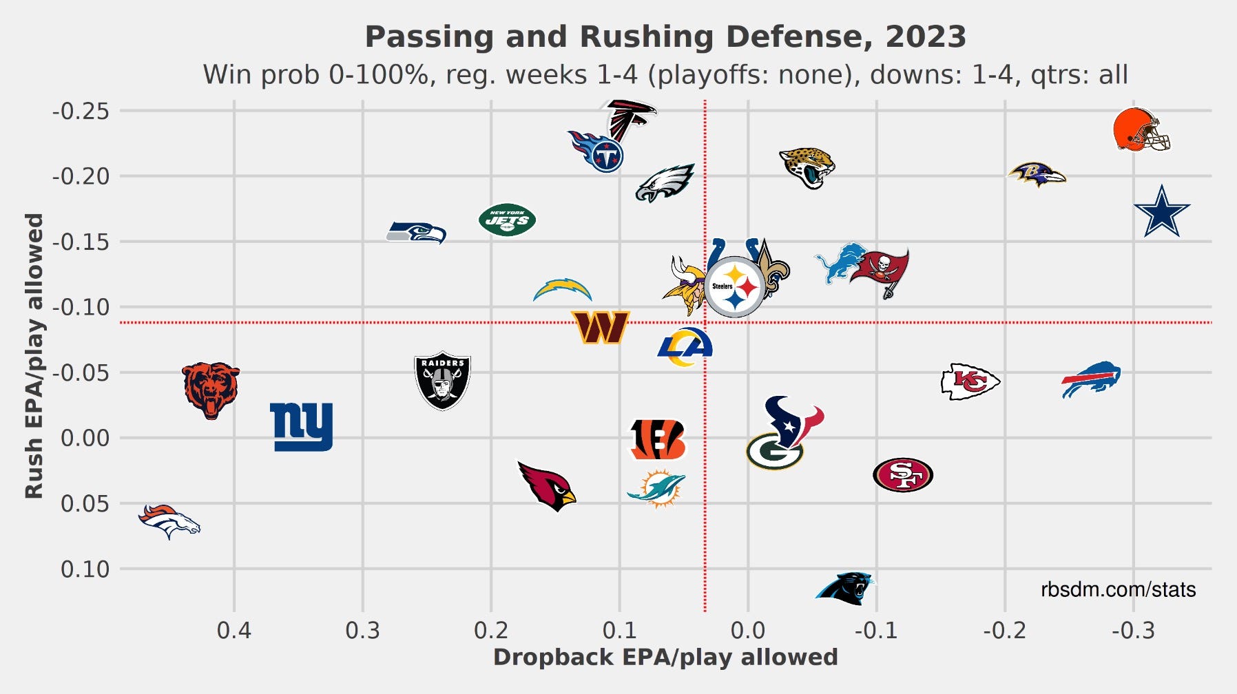 Through four weeks, the Bills sit at #2 in Total DVOA (behind the Cowboys) and hold the second-best passing DVOA (also behind Dallas), according to FTN. EPA also shows the Bills have one of the best defenses in the NFL after a quarter of the season is complete. Below is a chart from RBSDM that shows where each defense lines up after taking into effect their Rush and Pass EPAs.