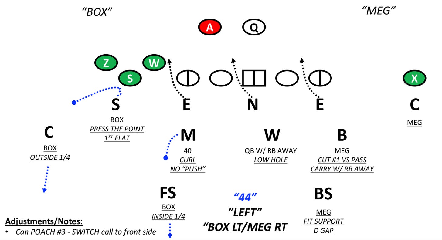 As illustrated above, if the defense runs Box as their sole coverage concept, they expose themselves to Spacing concepts. Versus Box, all the #1 WR has to do is wall off the CB as he breaks inside. Basketball on grass. There is space there for the WR to work because the low spot route occupies the Mike and the Safety is on his “rail.” Creating an intuitive coverage is a better way to go.