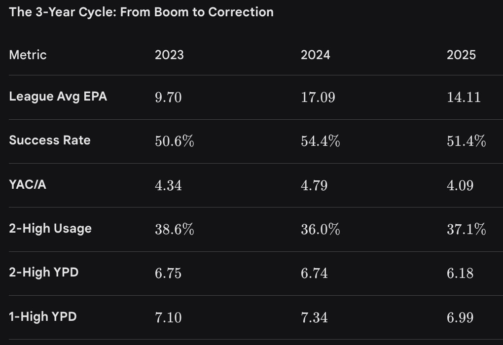 Though 2-High structural usage has maintained relative stability, it is the way the coverages are being played that has allowed defenses to regain some power, dropping the YAC/A to right at 4 yards and widening the Yards Per Dropback (YPD) to almost a full yard compared to closed-post coverages.
