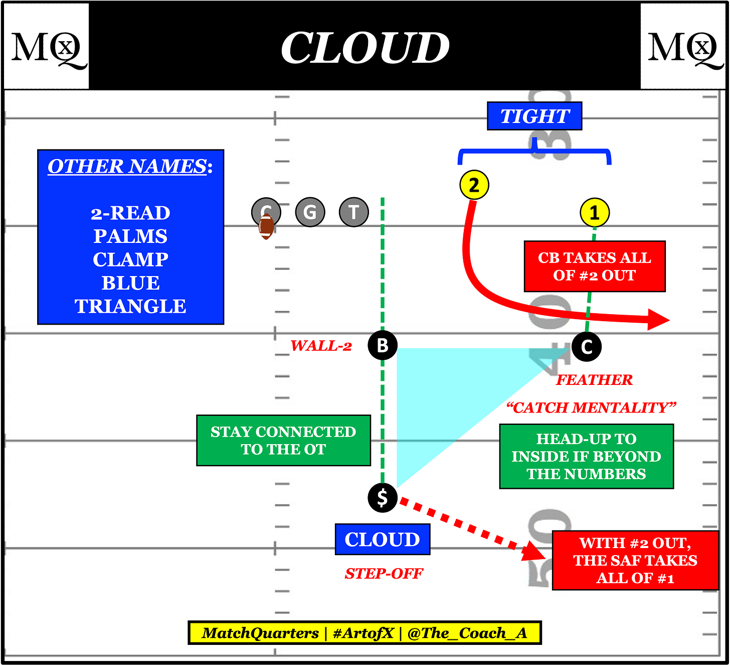 Cover 2 also has multiple ways of being played, from aggressive (Trap) to more passive (Cloud) concepts. Most are familiar with Palms, or 2-Read, at the lower levels of play. In those concepts, the CB will buy any route to the flat, nailing down on it immediately. The Safety will then climb to the vertical of #1, buying his route. The overhang is a “Wall-2” player and will not push to the flat unless #3 is to his side.