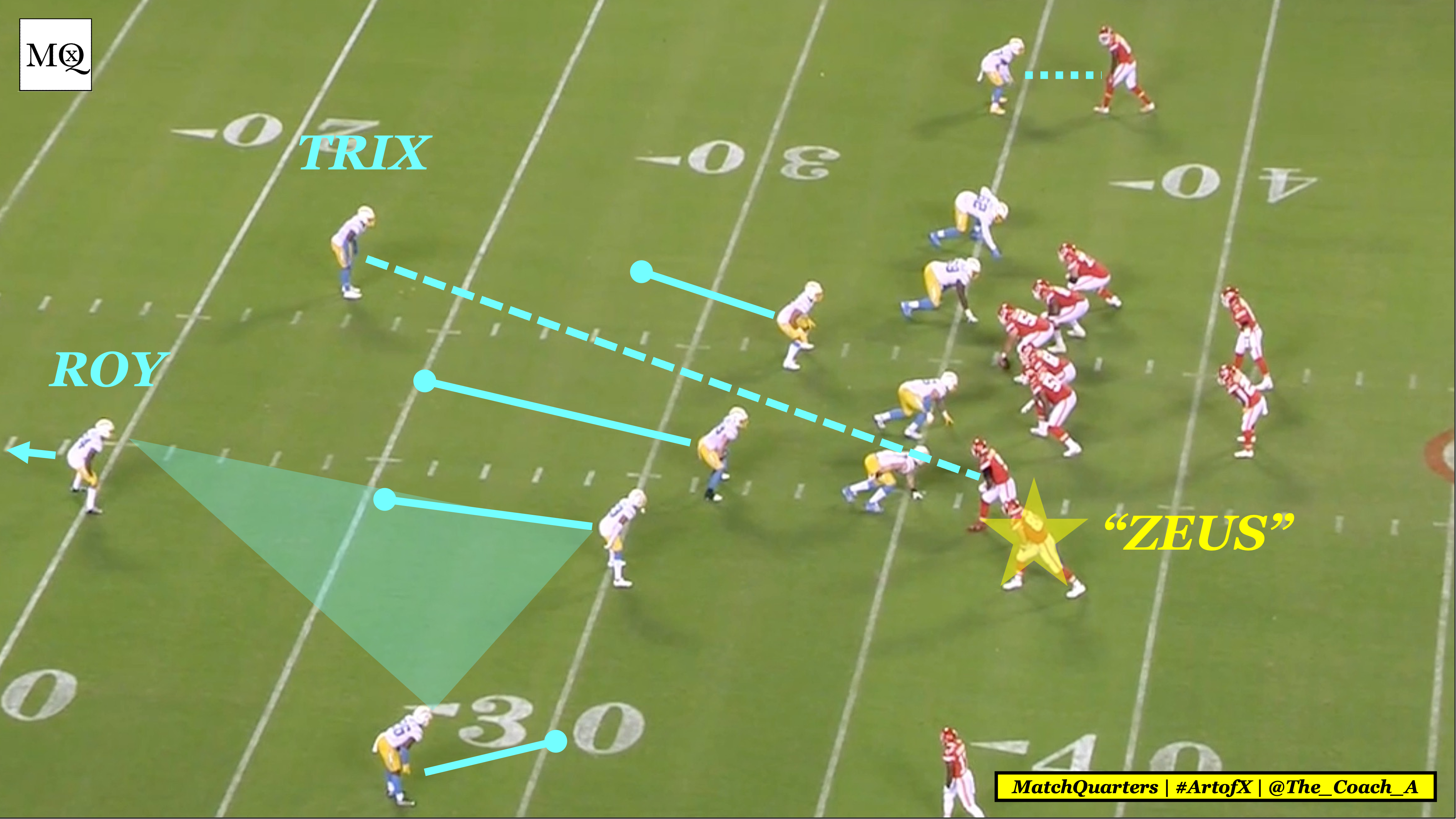 One reason why this system, in particular, is gaining popularity is that it is so hard to decipher with the naked eye. For QBs with EDGEs barreling down on them, it is even harder to process the actual coverage concept. The muddying of the waters leads to hesitation, which can spell disaster in the NFL. With so many offenses using change-of-strength, quick motions, and play-action on early downs, running a split-field system has tremendous benefits.