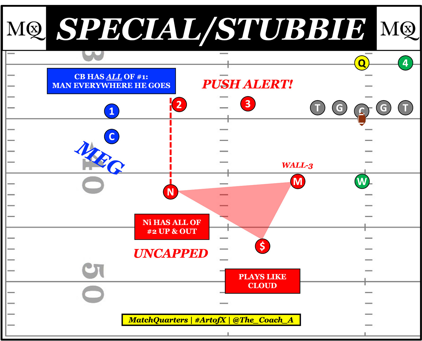 Outside of the NFL, the most popular split-field Trips coverage is most likely Special/Stubbie (Stubbie is a Saban term). In Special, the CB to the Trips side will “lock” on #1 and take him everywhere he goes (MEG). The Ni, Safety, and LB will play a Cloud concept (triangle) over the other two WRs. The concept creates a bracket on the #2 WR while supporting the LB on #3.