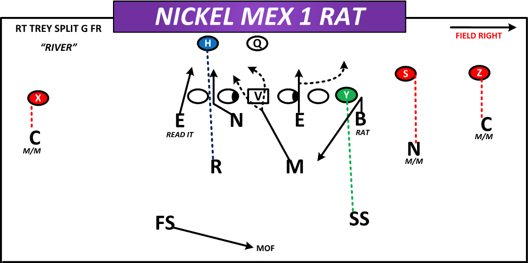 A simulated pressure is one that “simulates” a rush of more than four defenders. Replacement pressures on early downs that utilize the Mike or attack an internal gap with a second-level defender are also considered Sims. Below is an example of Aranda’s MEX path. The internal pressure simulates a five-man rush, whole the B-backer drops into coverage as the Rat. In all, only four defenders are rushing. Though Aranda chooses to run a 1-Rat concept behind the pressure, he could easily tag Cover 2 or Cover 3 behind it, which is why Sims are becoming so popular.