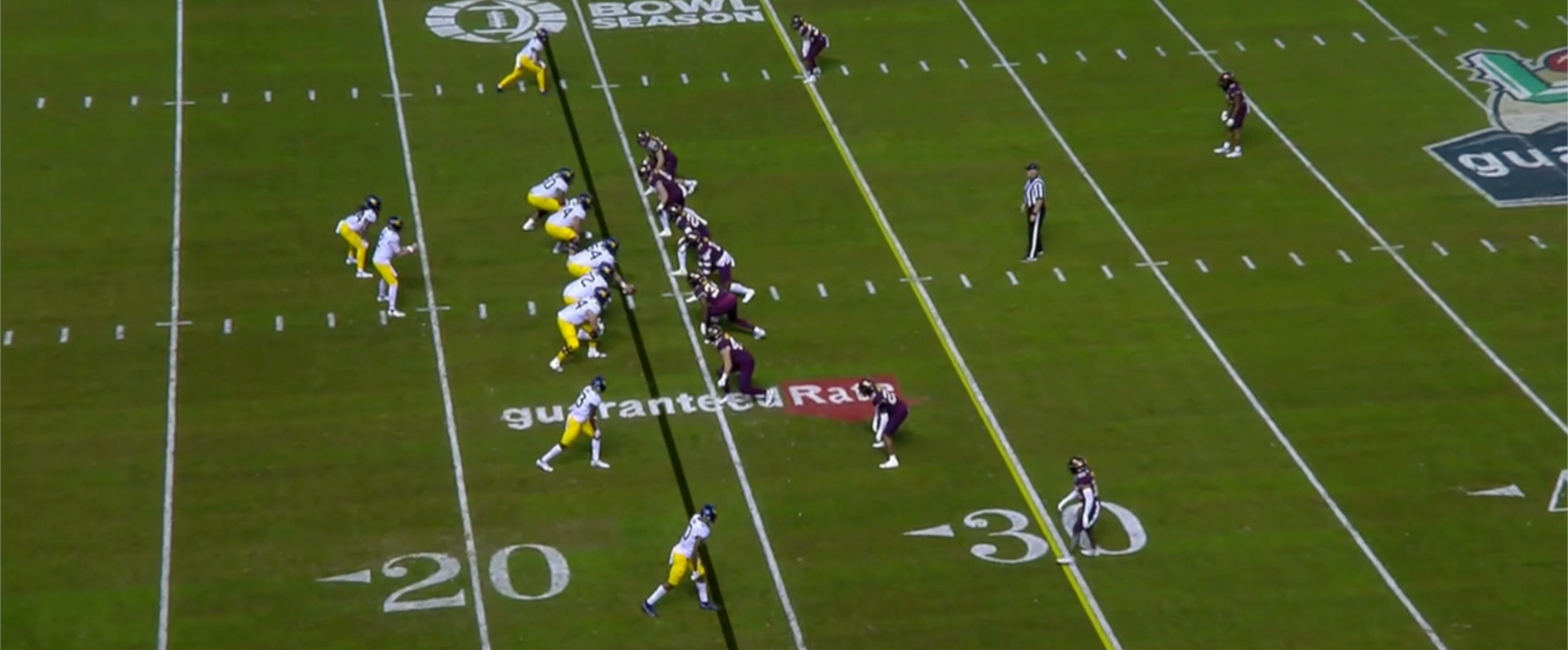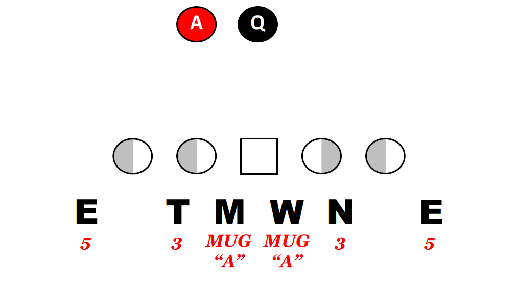 From the 5-O alignments, defenses can add an extra defender to create a six-man presentation. When choosing to do so, defenses most often choose to run a double A-gap mug presentation by the two ILBs (M & $ in the previous diagram). The front structure to accommodate the mugged ‘backers is what I refer to as a JET alignment, placing the DEs in 5s and the interior D-line in 3s (below).