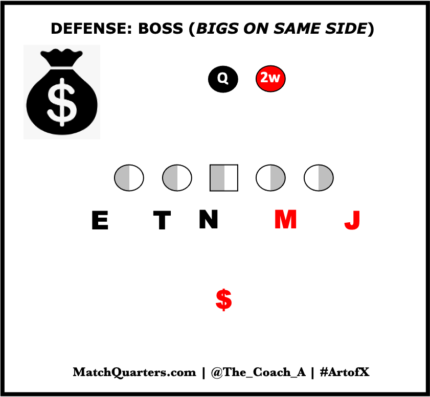 One of my favorite ways to attack a defense is the BOSS or LOAD Front (below). The front places all the “Bigs” on one side and the Mike and Jack (rush ‘backer/EDGE) opposite. The Saban system’s infamous NFL fronts use a Load Front to attack the offense. Field, Boundary, to the RB, or away are all ways you can set the front, and each has its special tag. In many cases, offenses will choose to slide the front to the “Bigs,” making their protection predictable. In reality, the defense is still creating man blocking with a 5-O alignment. Manipulation can ensue!