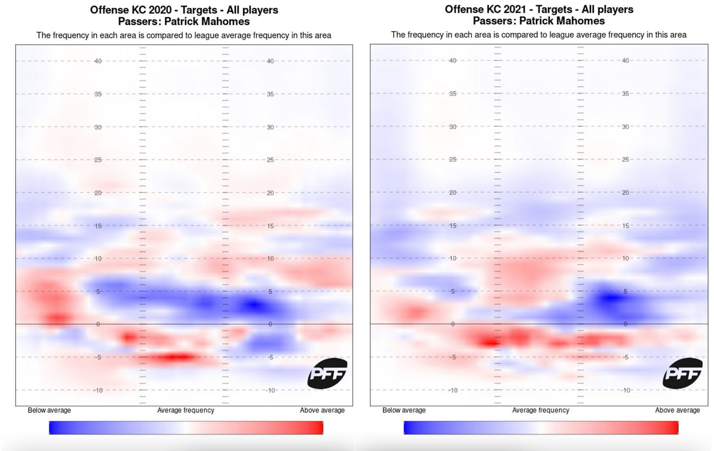 As teams competed with Patrick Mahomes and the offensive onslaught created by Reid, one common theme was two-high coverages. Below, PFF’s heat maps of Mahomes targets show a massive trend toward low and in the middle of the field. In ‘20, Mahomes targeted the soft areas outside, indicative of MOFC coverages. Looking at ‘21, things got more difficult for the Chiefs when they tried to throw the ball downfield.