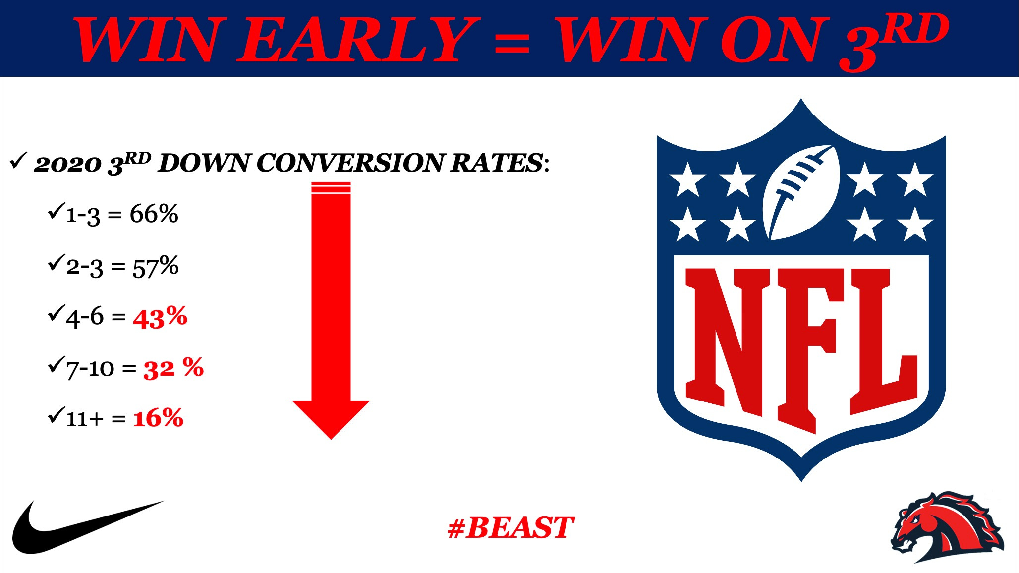 Most college football programs will have a slide like the one above, explaining the percentages of conversation by the distance the offense needs to gain on 3rd. Win on 1st usually means a defense will win on 3rd. Incorporate that most offenses are keen to go for it on 4th Down in certain areas of the field, and the need to understand situations is amplified.