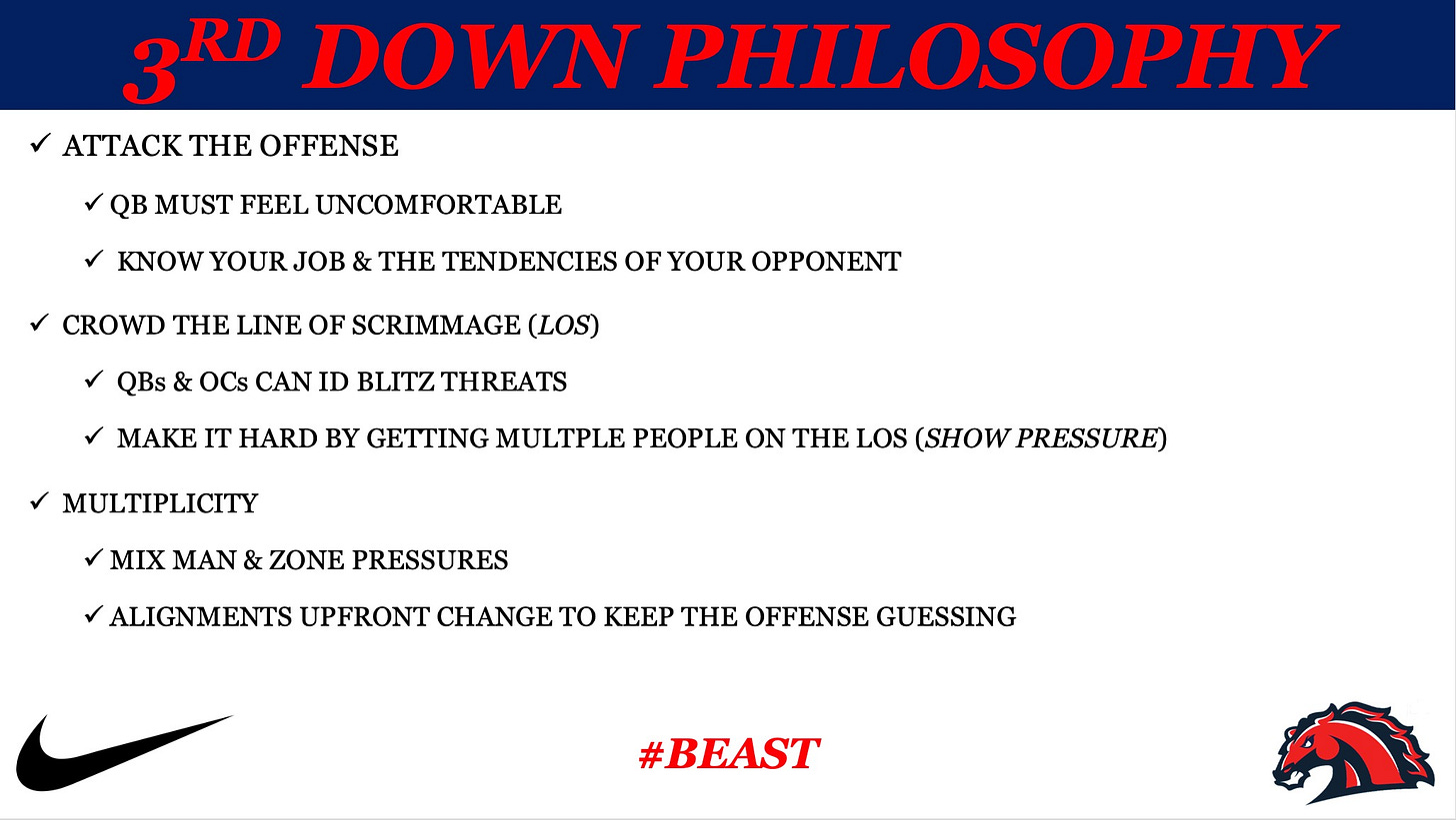» Author’s Note: As coaches, we all borrow and ‘steal’ from one another. Mike Elko, the Head Coach at Duke and former Texas A&M DC, has one of the best 3rd Down clinic talks I have ever seen. Many of my philosophies in this article's slides are modified from that talk.