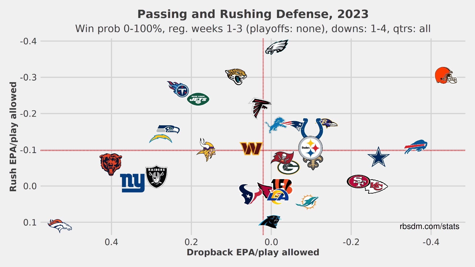Looking at ‘raw’ EPA numbers (above), Dallas currently sits 3rd in EPA/play and matches that against Dropback passes (take out RPOs and Play-Action). The Cowboys have problems in their run defense, where they sit 17th in EPA. Digging deeper, the Cowboys are dead last in the NFL in rushing success rate at 50.8% (RBSDM). What does that mean? Half of the offensive runs Dallas faces end in a net positive EPA for the offense.