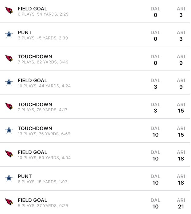 The biggest issue for Dallas last Sunday was getting off the field on defense. People will talk about the offense’s success rate in the Red Zone, but the Cardinals scored on all five of their first-half drives (above), and only one was less than 50 yards (i.e., not due to turnovers). 3rd Down was an issue, too, with the Cardinals going 5/10 on the day.