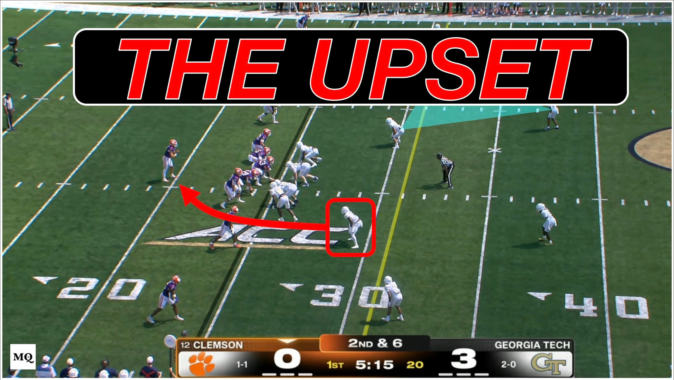 Against Clemson, Gideon employed a simple pressure on early downs (1st/2nd) to counter the Tigers' protection schemes. Utilizing boundary or weak edge pressure allowed the Georgia Tech defense to stay ahead of the chains on early downs. Moreover, the secondary employed a half-field zone concept, which plays Quarters away from the pressure (to the field) and uses man coverage against the blitz. In the Saban vernacular, these are known as “Big 12s” and were popularized several years ago.
