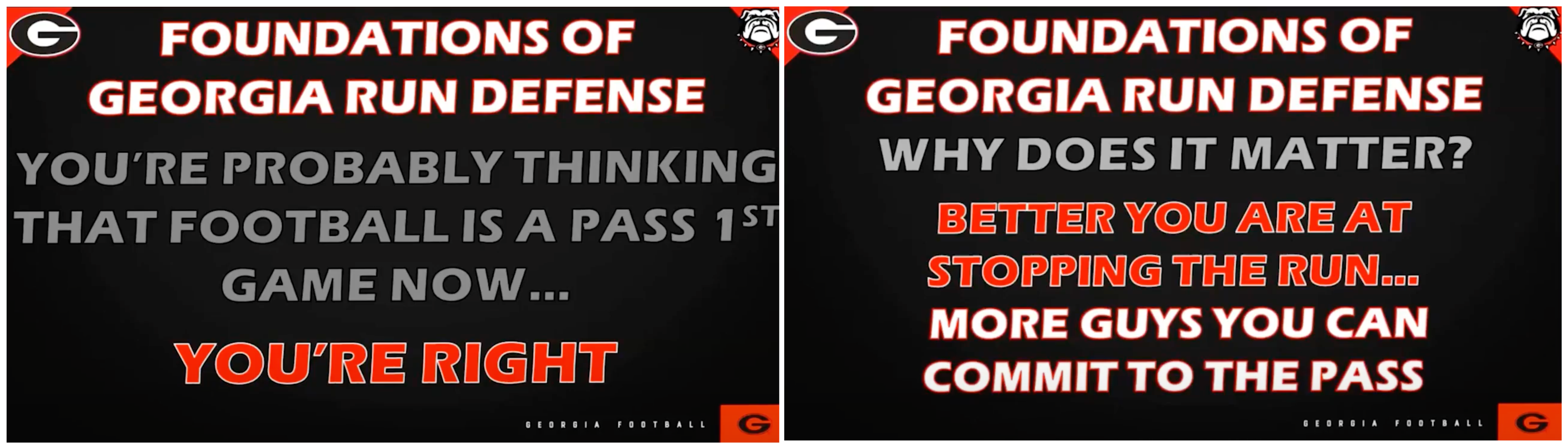 One of the system's main philosophies has been the ability to stop opponents' run games with as few defenders as possible. Georgia must have a superior defensive line in talent and technique to do this. It also needs to have answers.