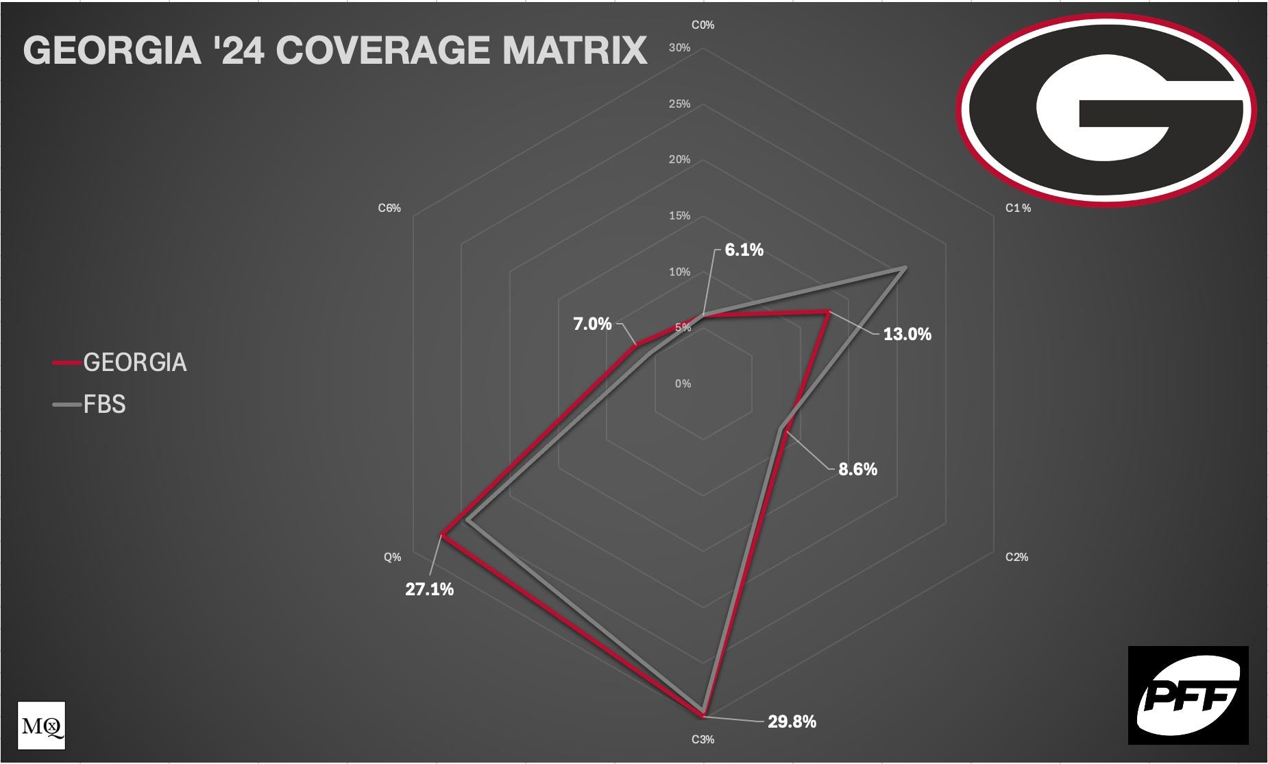 Georgia's defense generally mirrors the average FBS defense (above). However, in recent years, the Bulldogs have run more split-field than closed-post coverage, which can be attributed to a shift in internal philosophy and the rise of mobile quarterbacks. Split-field coverages allow the Bulldogs to hide intentions, leverage motion, and lean into their four-down base. But that wasn’t always the case.