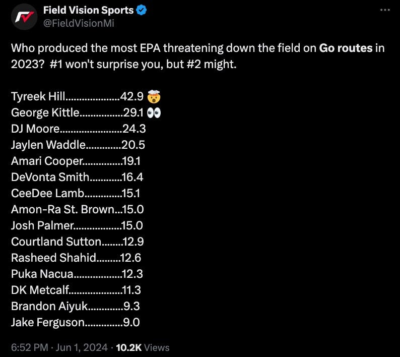 Shanahan also uses a collection of hybrid players to create mismatches. When utilizing a Base defense, the 49ers have multiple ways to attack slower defenders in the passing game. RB Christian McCaffery and WR Deebo Samuel can be used in almost every position on the field to get the defense into a bind. TE George Kittle is also a match-up nightmare, as the tweet from Field Vision Sports illustrates. He’s the #2 receiving threat on Go routes in the NFL.