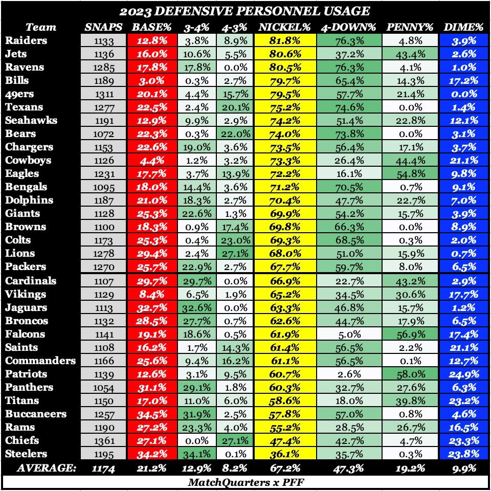 Nickel is the new Base. Only the Buccaneers and Steelers ran a traditional Base defense on more than a third of their snaps. As stated, the average NFL defense uses Base on one out of every five snaps.