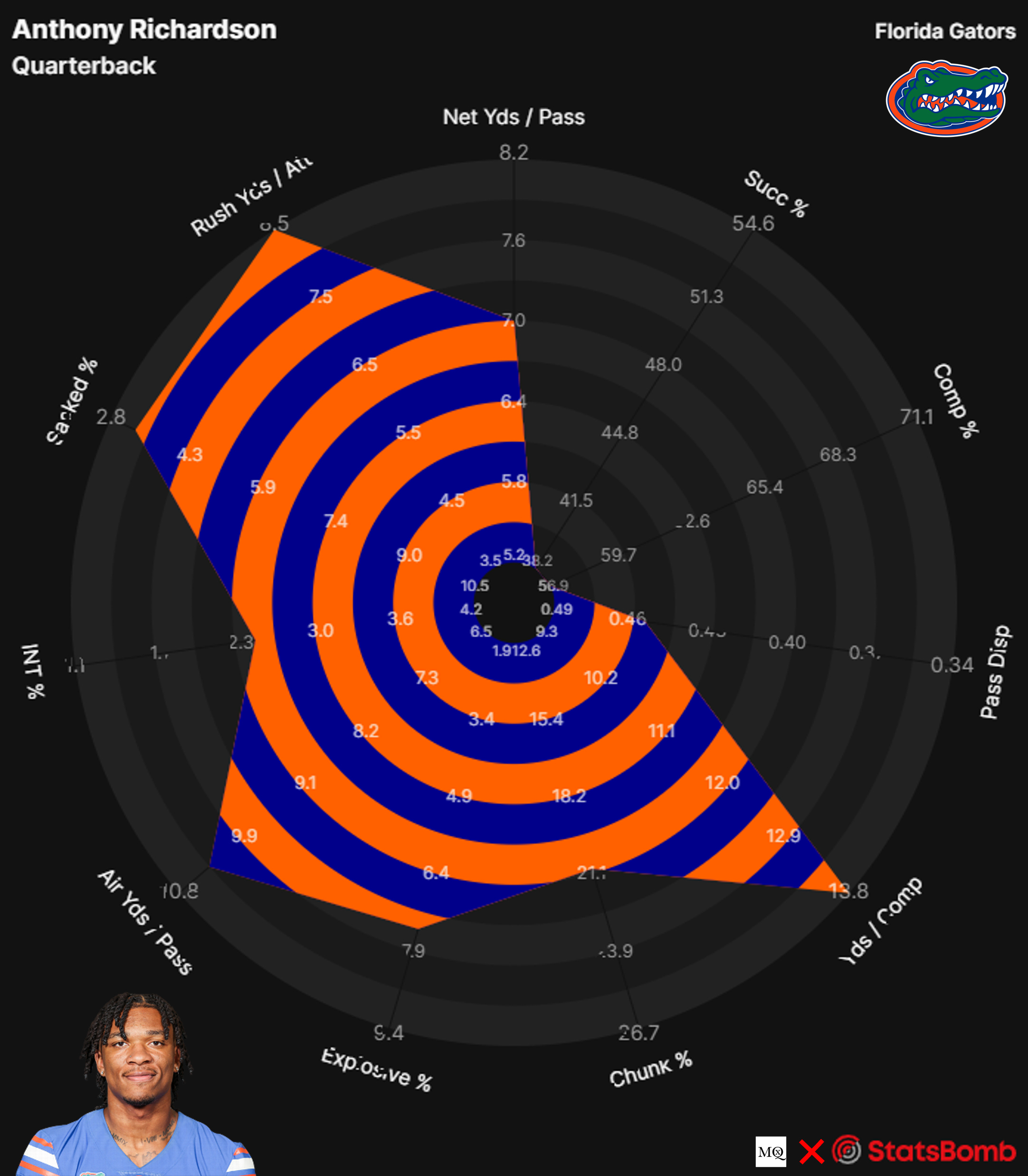 As you can see, Richardson lacks accuracy in these metrics, but his arm strength and deep ball stats are o…