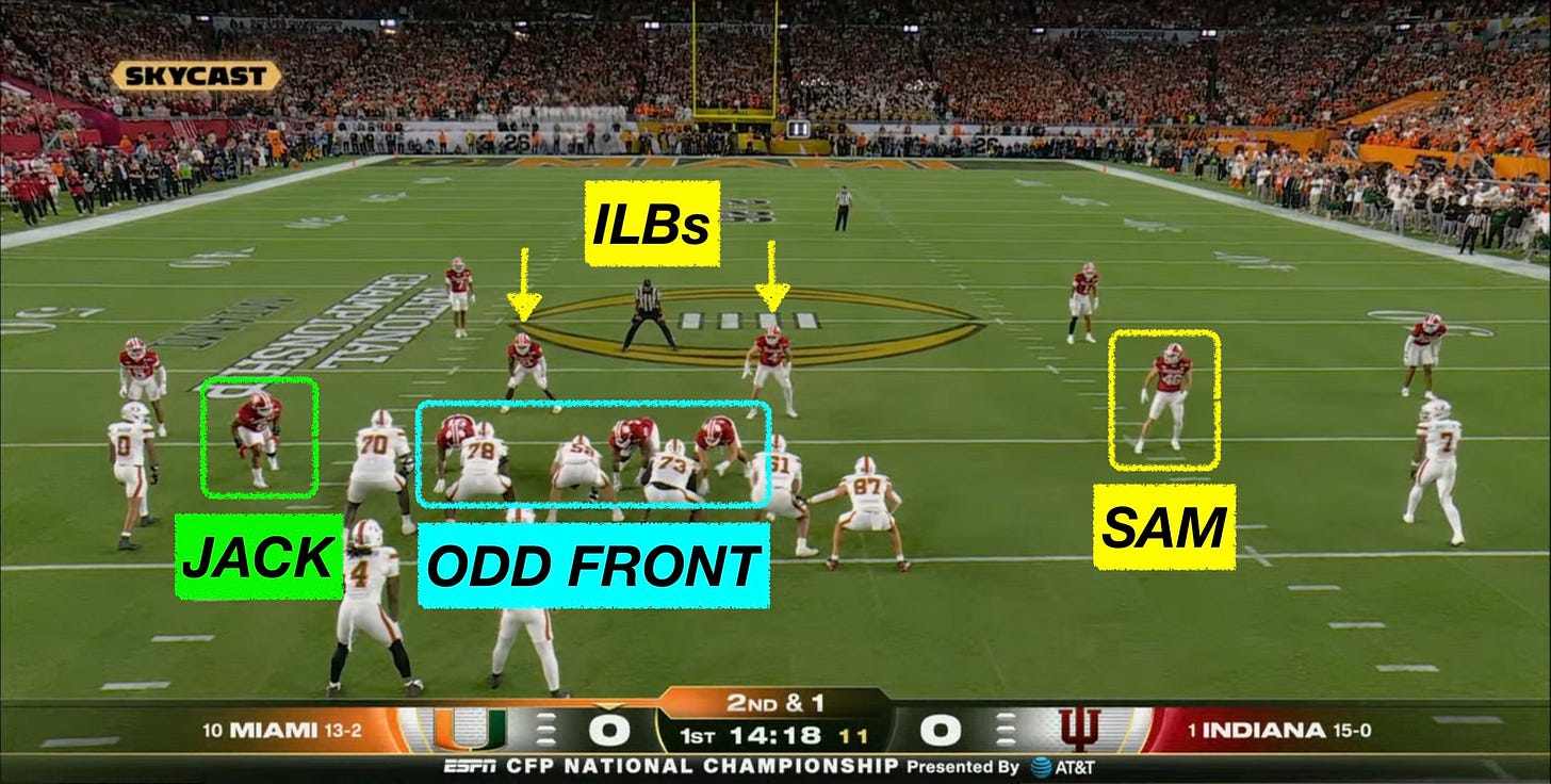 Indiana is built to stop the run and attack your protection schemes with off-ball linebackers. In fact, the sack leaders for Indiana in 2025 were Rolijah Hardy (21) and Jones. The Mike linebacker, Aidan Fisher (4), finished with 4.5 sacks, barely behind three of the starting D-linemen.