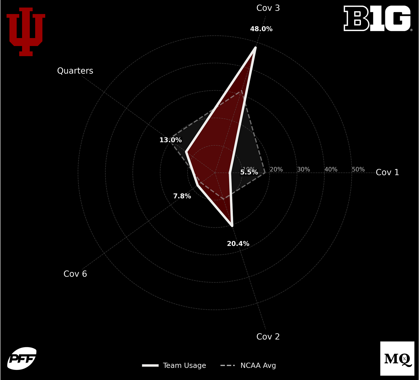 In an era where the Spread is still king in college football, the Hoosiers tried to keep their base personnel on the field as much as possible. To eliminate conflict, the Hoosiers mainly played Cover 3, with Tampa rotations as a change-up. To help their linebackers, Haines played the second-lowest percentage of man coverage in the FBS (8%) and ran almost no Cover 0 (2.5%).
