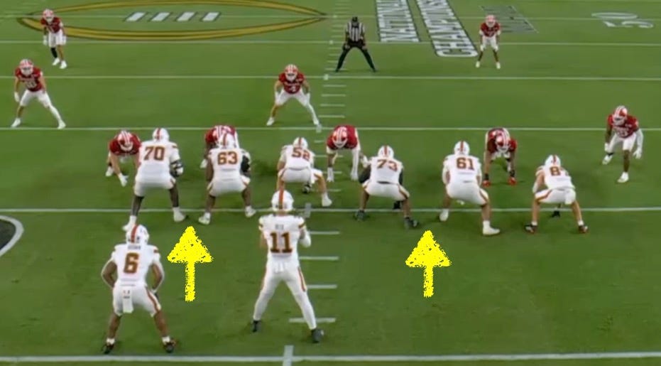 Miami’s O-line typically kept its splits tight, which meant the Hoosiers would have difficulty utilizing quick stunts or “plug” pressures (vertical LB blitz) to attack the downhill run game of the Hurricanes. Attacking from the edges could be dangerous as well, because of Miami’s dangerous Slot Malachi Toney (10).