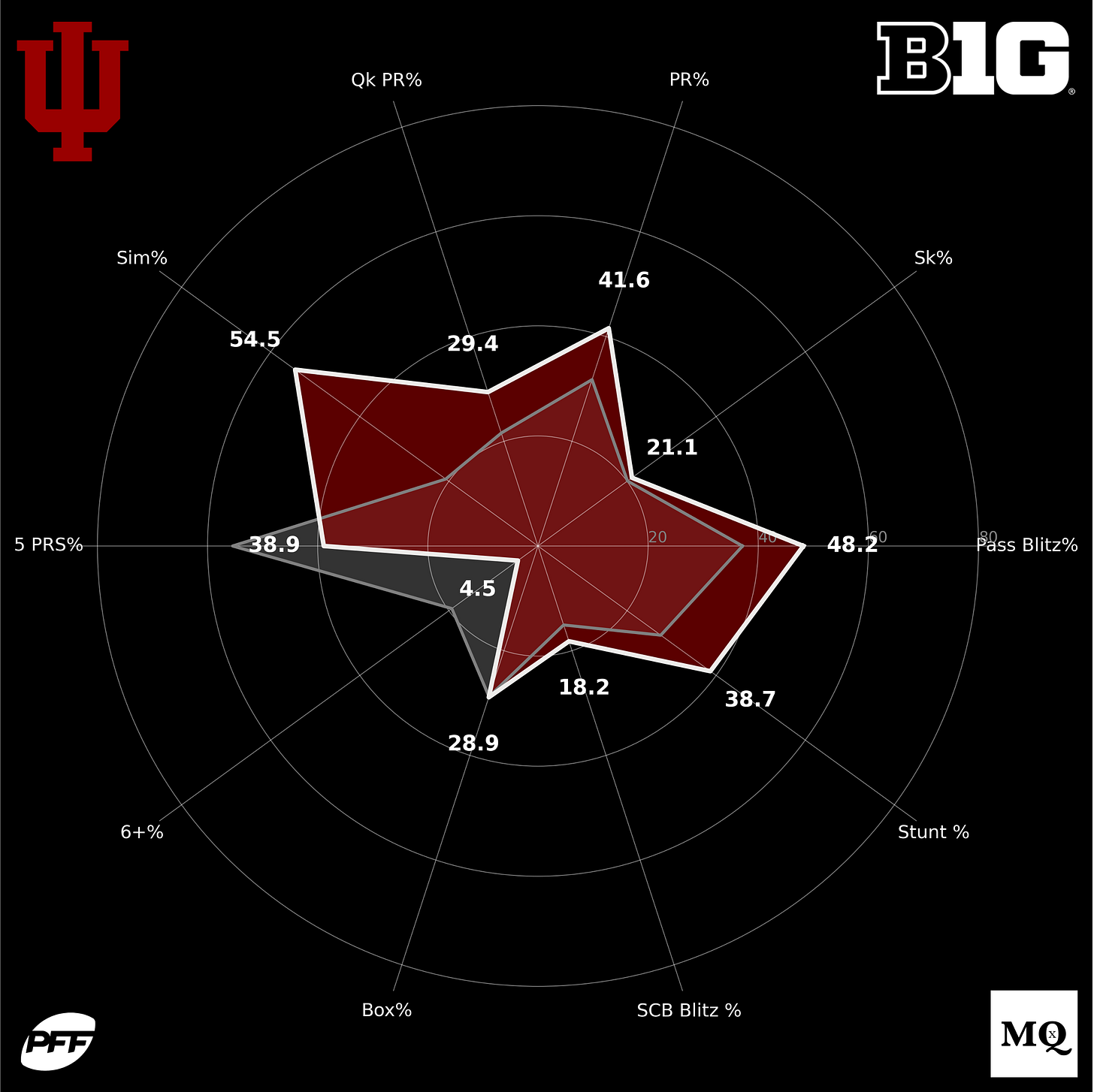 The most impressive stat that defines the “smoke and mirrors” scheme in Bloomington is the Unblocked Pressure (UPB) metric. Indiana finished third in that data point (~14%), illustrating that the blitz paths Haines was cooking up were overwhelmingly confusing offensive lines.