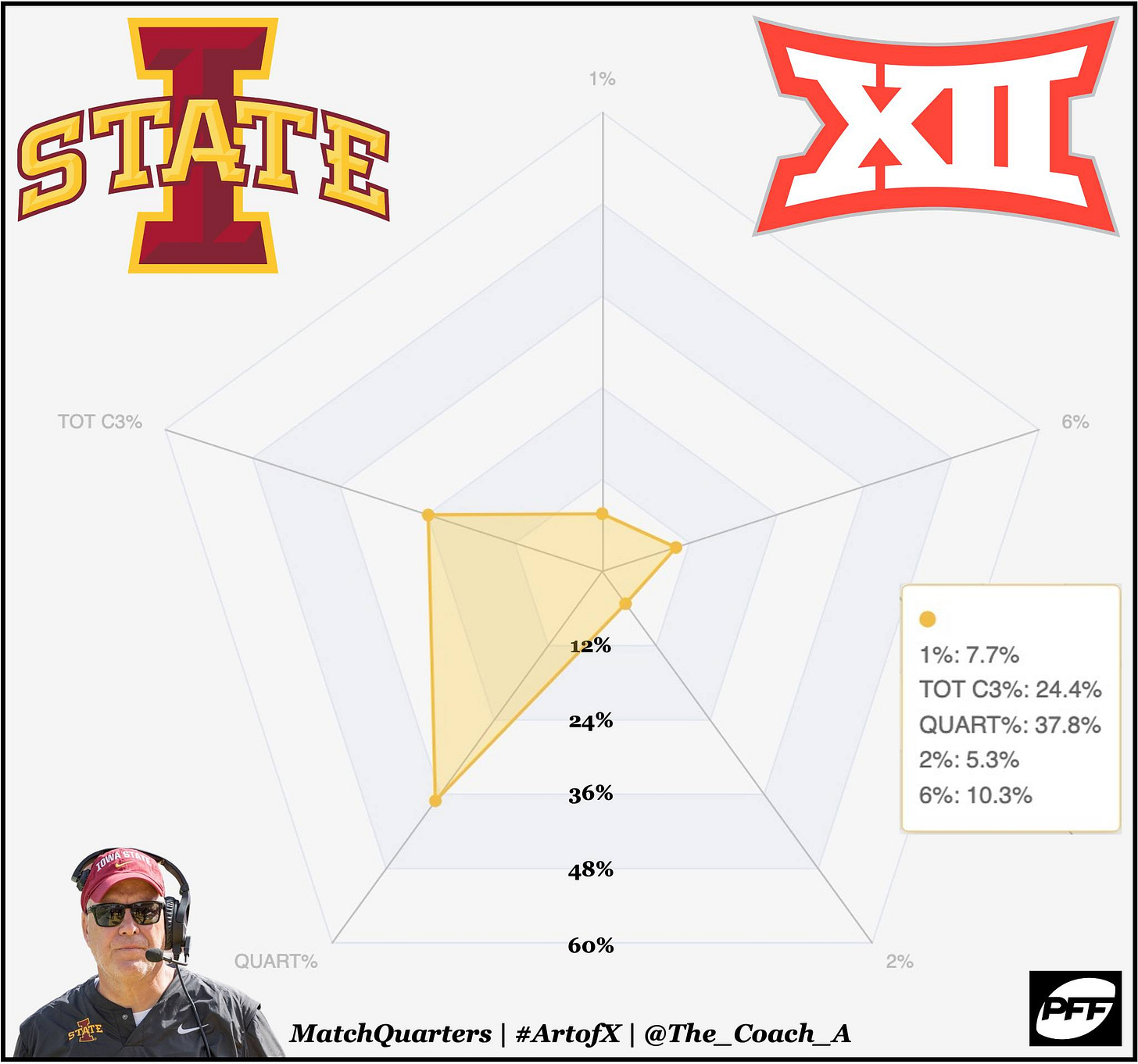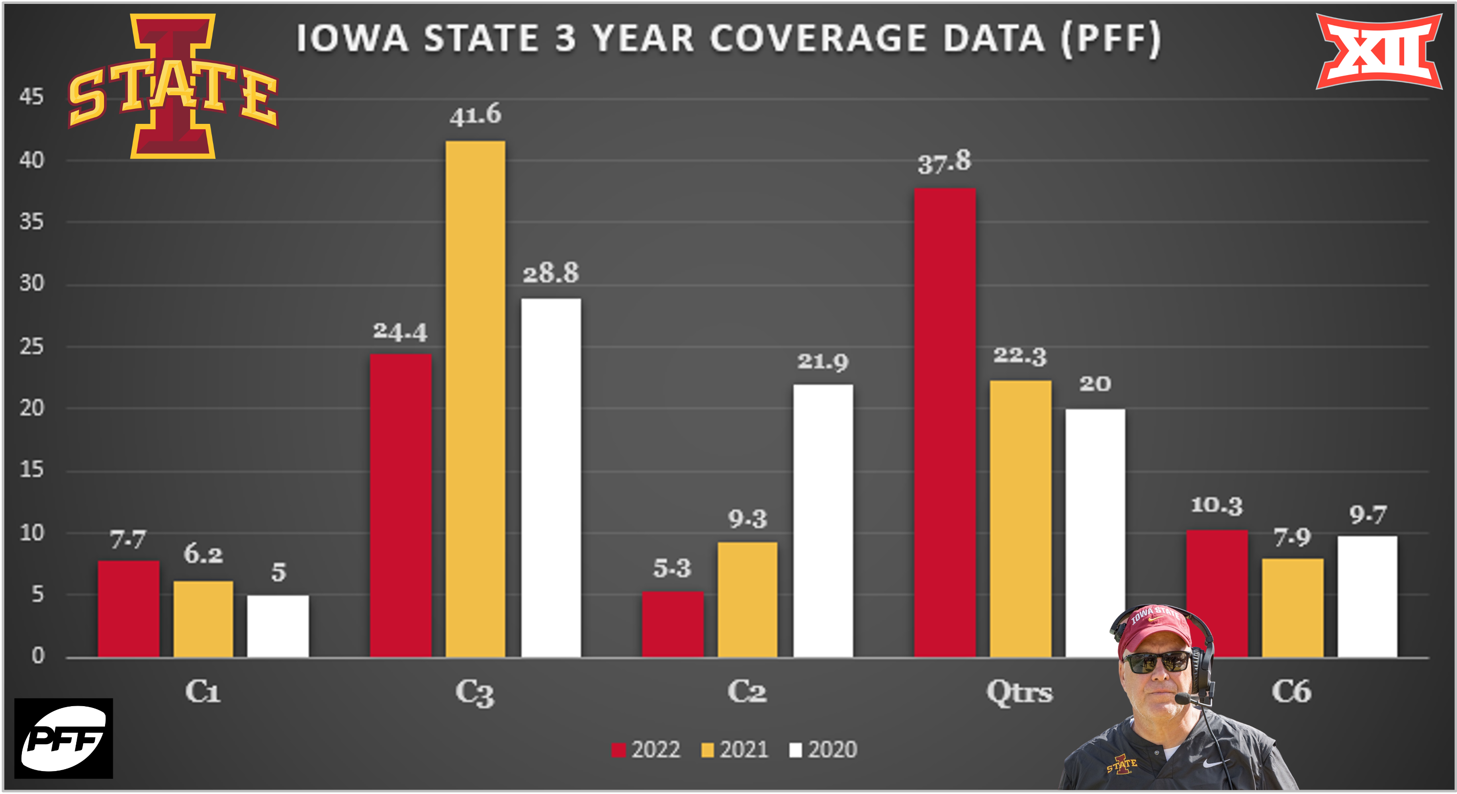 Beginning in 2020, the Cyclones raised their Quarters usage by 17.8 percentage points and lowered their Cover 2 reps by 16.3 percentage points. That is a giant swing. Interestingly, the Cover 3 percentages have fluctuated from 28.8% in ’20 to 41.6% in ’21, only to fall back to the 20s in ’22. The 2022 Iowa State coverage matrix is shown below.