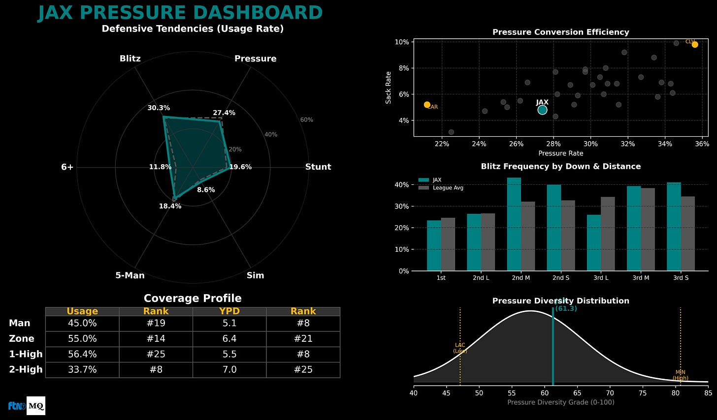 If one trait defines this Jaguars defense, it is their statistical coin flip in coverage usage behind blitzes. Typically, coordinators will have a “tell.” For instance, in 2025, Fangio is using man coverage behind his pressures at a 67% clip, with a closed-post coverage on ~75% of his calls. Flores, on the other hand, is the league leader in zone pressure (~80%) and has the highest split-field coverage rate behind it (56%).