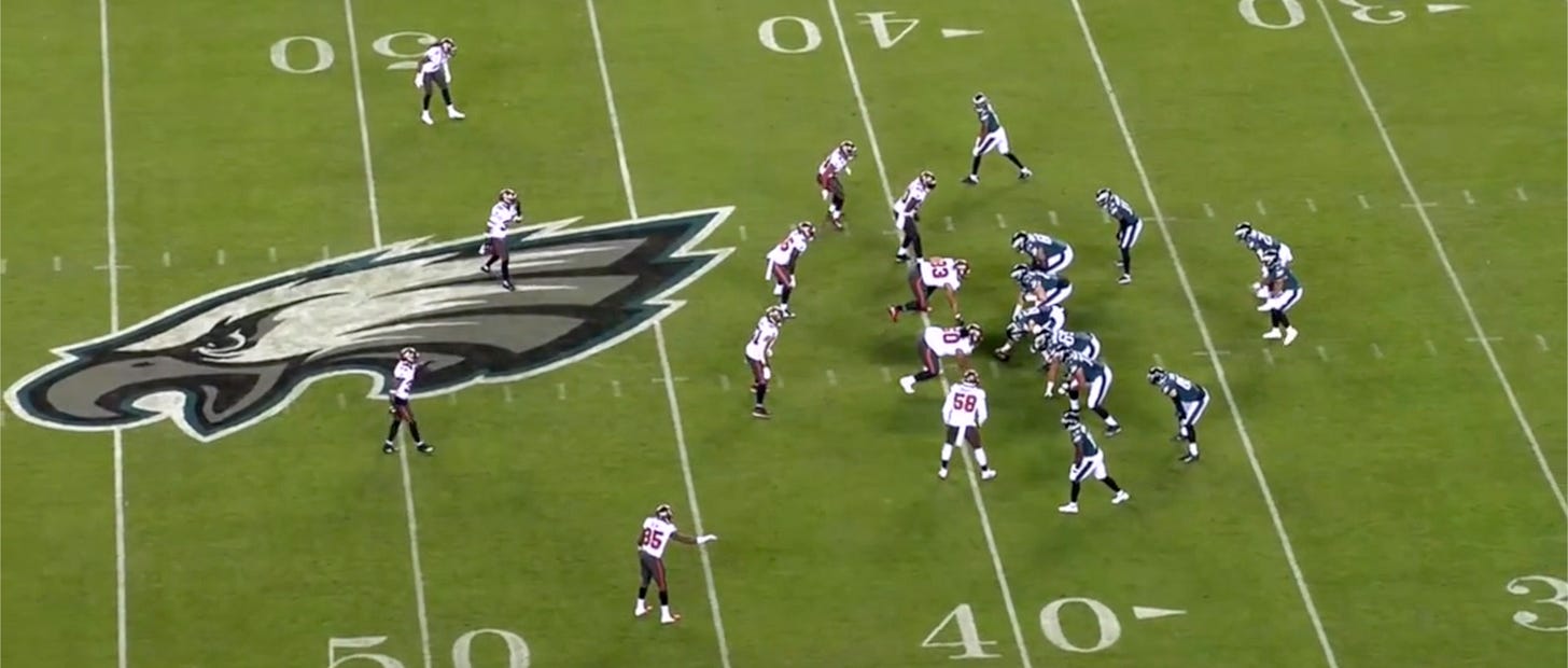 Against a QB that can run, blitzing isn’t always the best. Instead, manipulation of the run fits up front by using simple D-line stunts allowed the Bucs to stay ahead of the chance and keep coverage integrity against the pass. Tampa Bay needed to keep Hurts contained while challenging the run game at the LOS. Coverage-wise, the Bucs needed to establish themselves in certain areas. The offense liked to attack with RPOs and play-action. Instead of blitzing to force the issue, Tampa used line stunts up front to stop the run and eliminate easy throws for the QB.