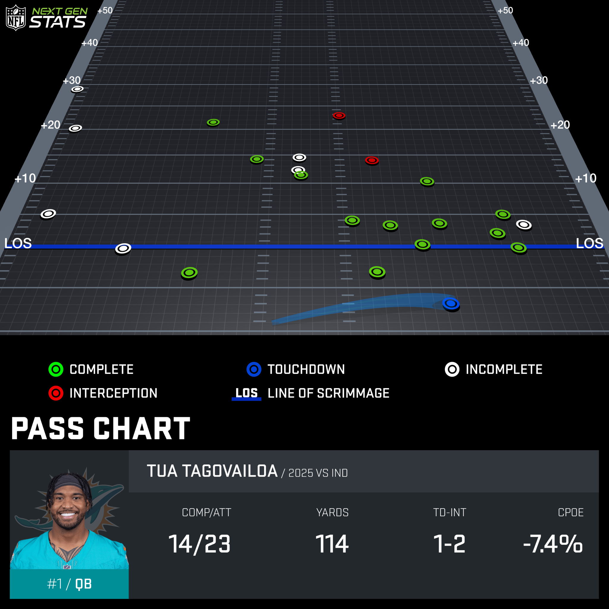 The Colts were also able to garner two total sacks, one coming in front of a Quarters pressure and three total pressures on the day. The coverage pressure on Tua’s passing attempts was enough to garner the second-best Turnover Worthy percentage (TW%) of the weekend behind the Seahawks. Overall, Tua was uncomfortable passing and limited to short intermediate throws into tight windows. He finished the day 1-4 with one interception on throws over 20 yards.