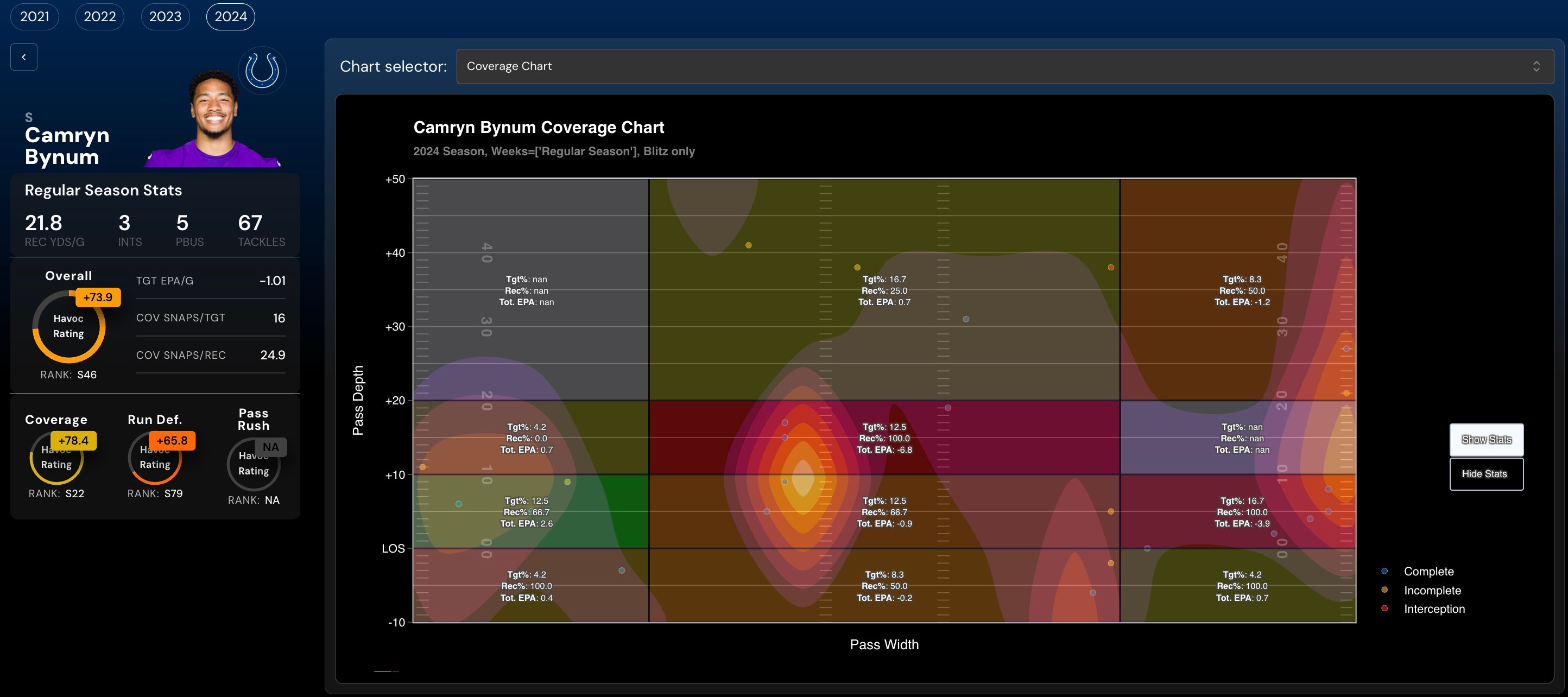 Tua was limited in his ability to throw all day. Against the blitz, the Dolphins’ quarterback was 4-7 for 24 yards and one touchdown. His overall Catch Percentage Over Expected (CPOE) was -7.4% and rose about -10% against the blitz. Tua finished the weekend with the lowest EPA/DB at -.571 and was only surpassed by rookie Cam Ward, who had to play the Broncos, against the blitz (-1.093).