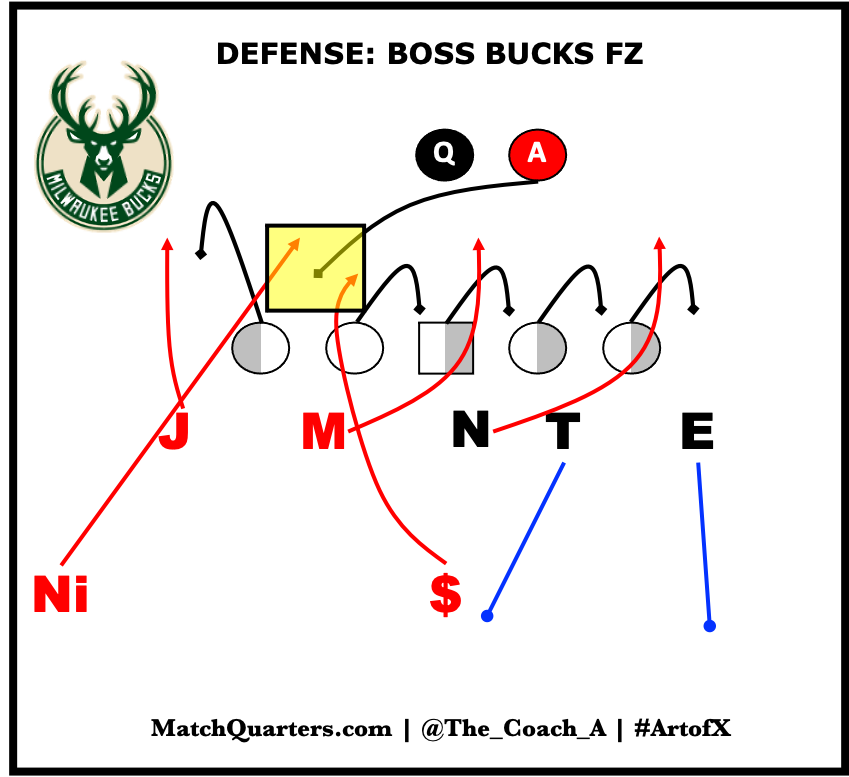 One of my favorite five-man pressures is what I refer to as “Back Check.” The pressure essentially attacks the B-gap to the side of the RB with the two linebackers to that side. To get the Tackle to set wide, the DE to the side of the RB will COP, or contain rush, setting an edge. The defense can create " plus " numbers in the B-gap against teams that like to run Slide-Lock away from the RB; the defense can create “plus” numbers in the B-gap. Below is my BOSS (Bigs on Same Side) BUCKS pressure I diagramed in Anchor Points. The pressure illustrates the concepts’ effectiveness away from the RB as well.