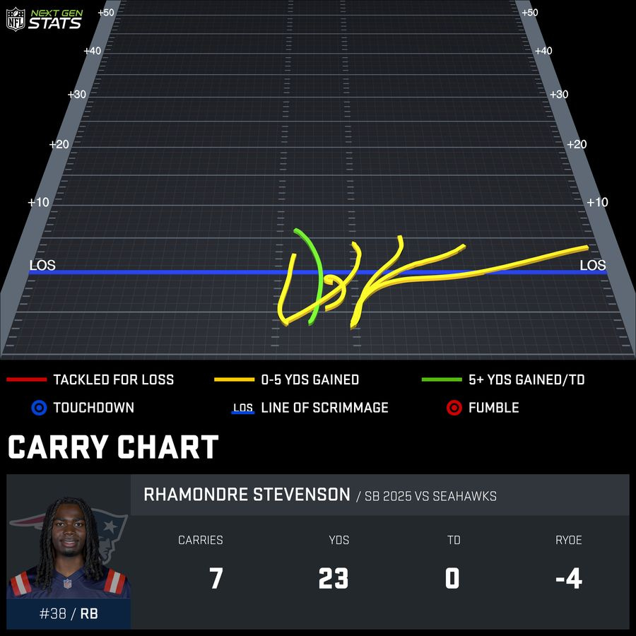 Patriots running back Rhamondre Stevenson was a non-factor, going 7-for-23. Back-up RB, and someone pundits looked to have at least one explosive opportunity, TreVeyon Henderson, didn’t fare much better, finishing 6-for-19. These numbers weren't just a result of a heavy box, but a byproduct of Seattle's defensive structure, which squeezes the space from the outside in.