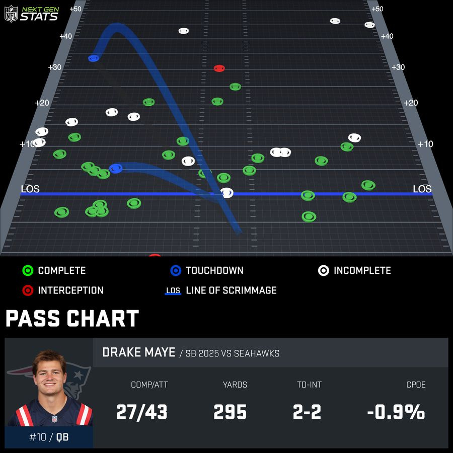 At halftime, Patriots second-year quarterback Drake Maye had gone 6-for-11 with only 48 yards through the air. He had also been sacked three times (-30 yards) and held a measly 3.2 air yards per completion. Maye was only 2-for-5 on throws over five yards. Seattle had essentially created a cinched-in grip on New England’s deep shot offense.
